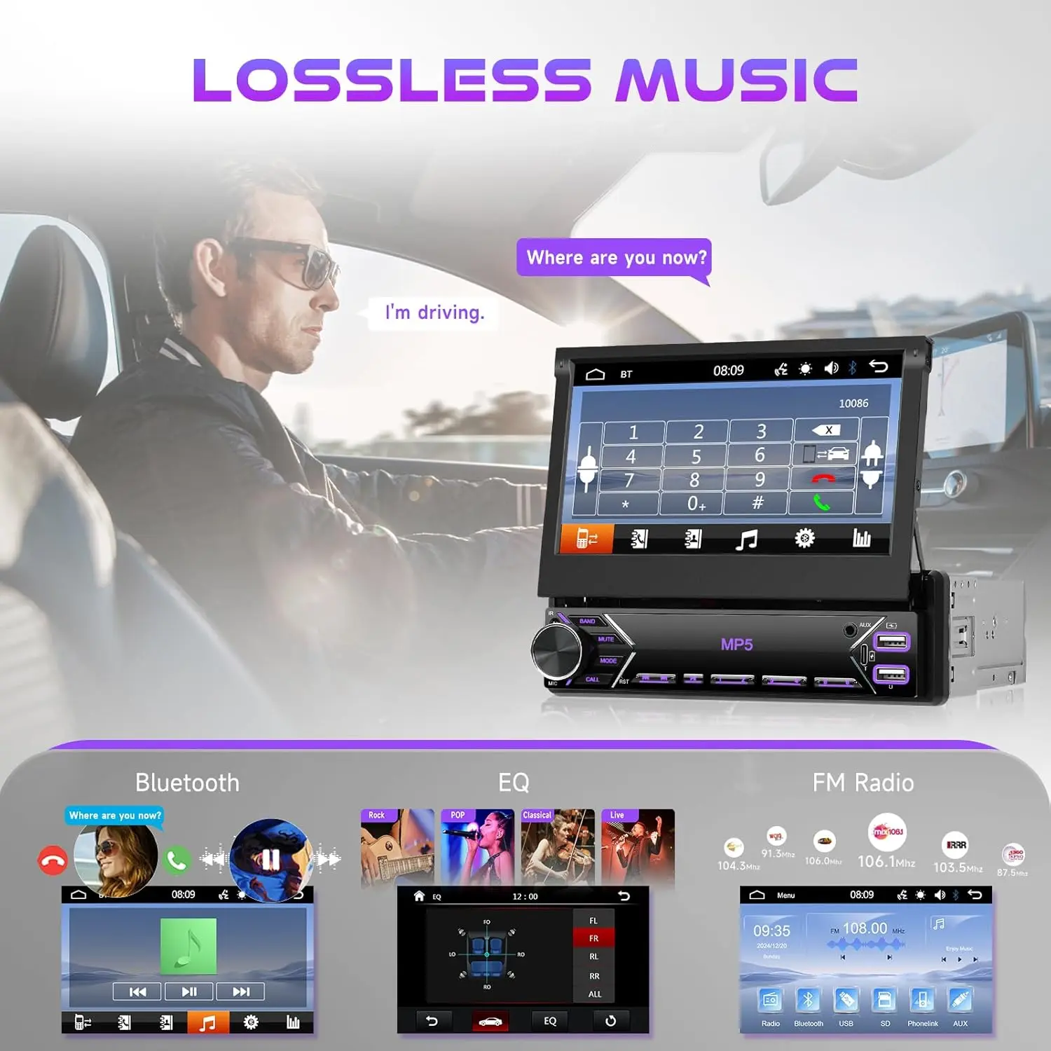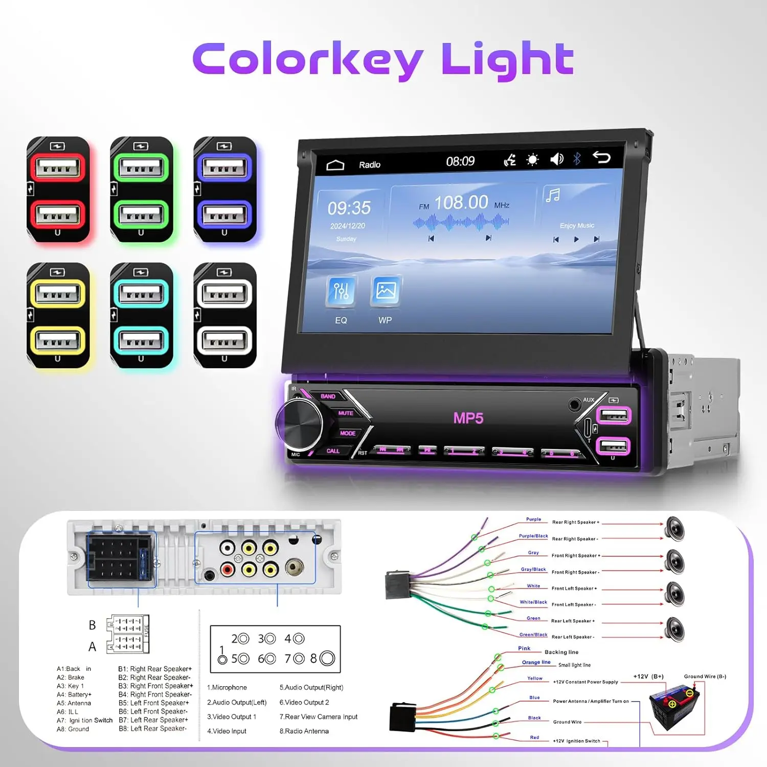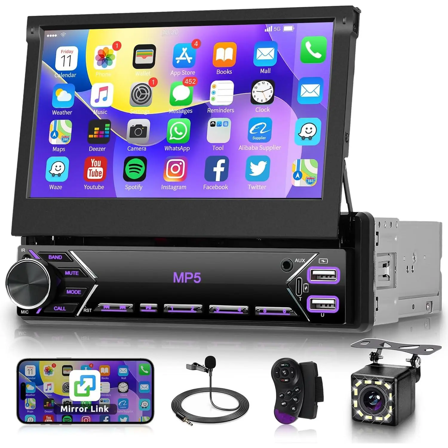 Integrated functions: iOS/Android mirror link, reversing camera, steering wheel controls, Bluetooth, Calculator Function, Color backlight setting, Calendar Viewing Function, EQ and USB Type-C Interface, Share same video, multilanguage, Time Setting