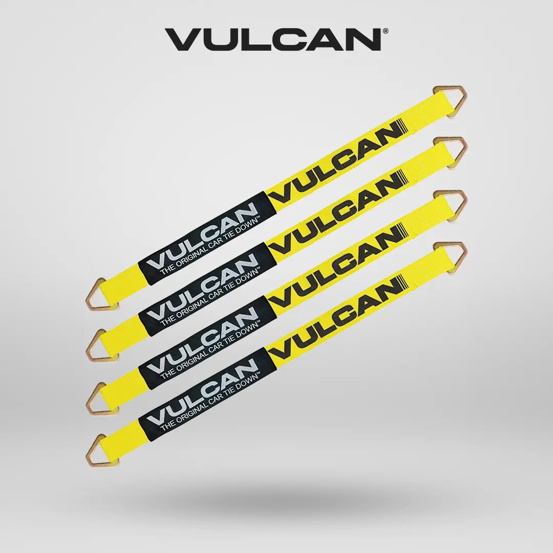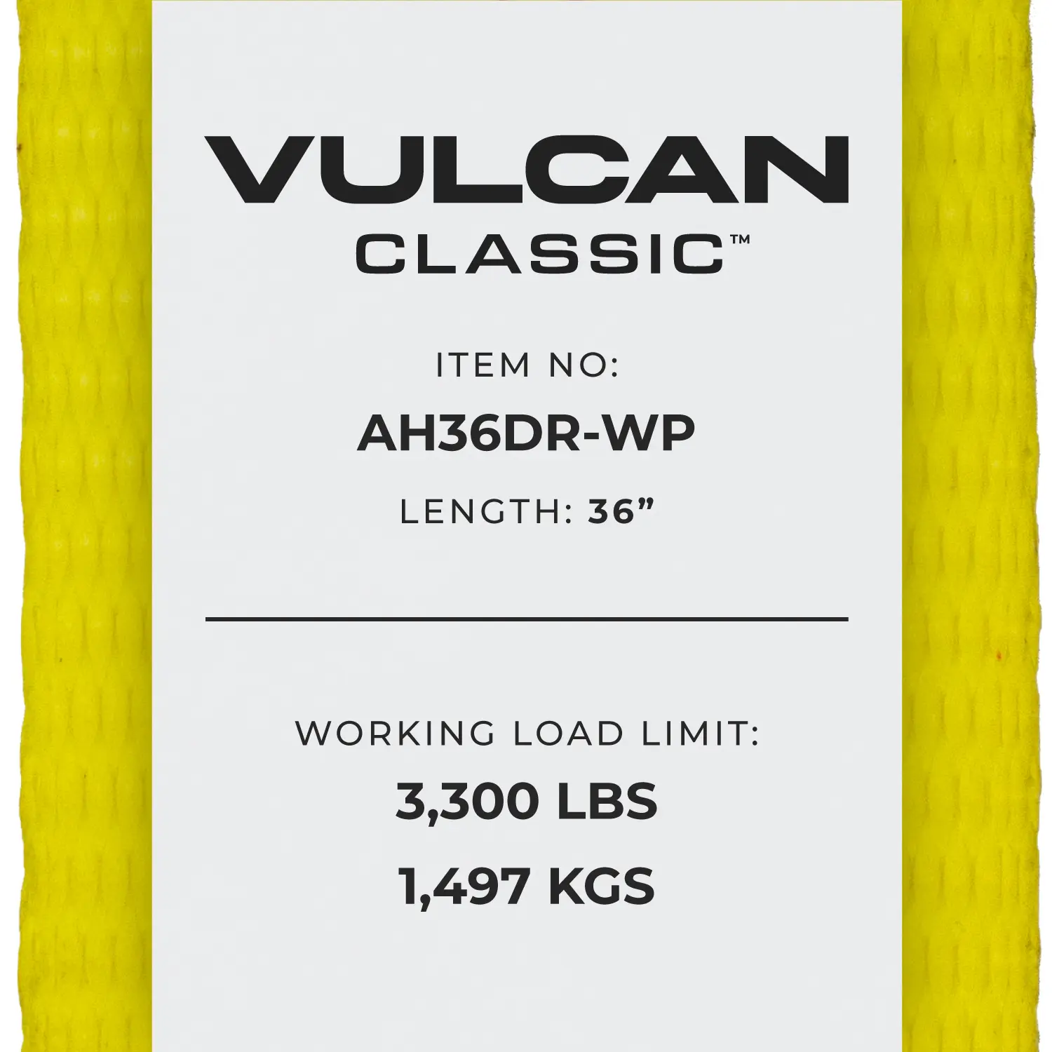 The yellow tie down webbing is a versatile product that can be used to secure any car, truck, Jeep, ATV, UTV, or SUV. It is designed for when you need to tie down by the axle or through the vehicle's rims. The webbing is flexible and has a width of 2" x 36" inches, making it easy to use and maneuver.