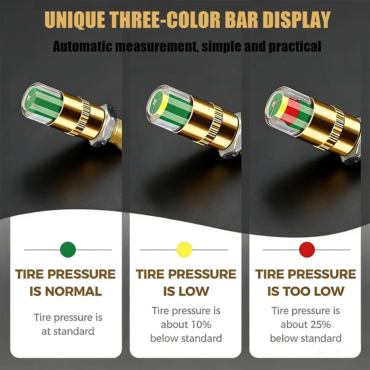 ·Visual Pressure Alert: The 3-color eye system on these tire pressure monitoring caps provides instant tire safety checks. Green indicates normal pressure, yellow signals 10% drop, and red shows 25% lower level, letting drivers spot issues with these tire pressure caps instantly.