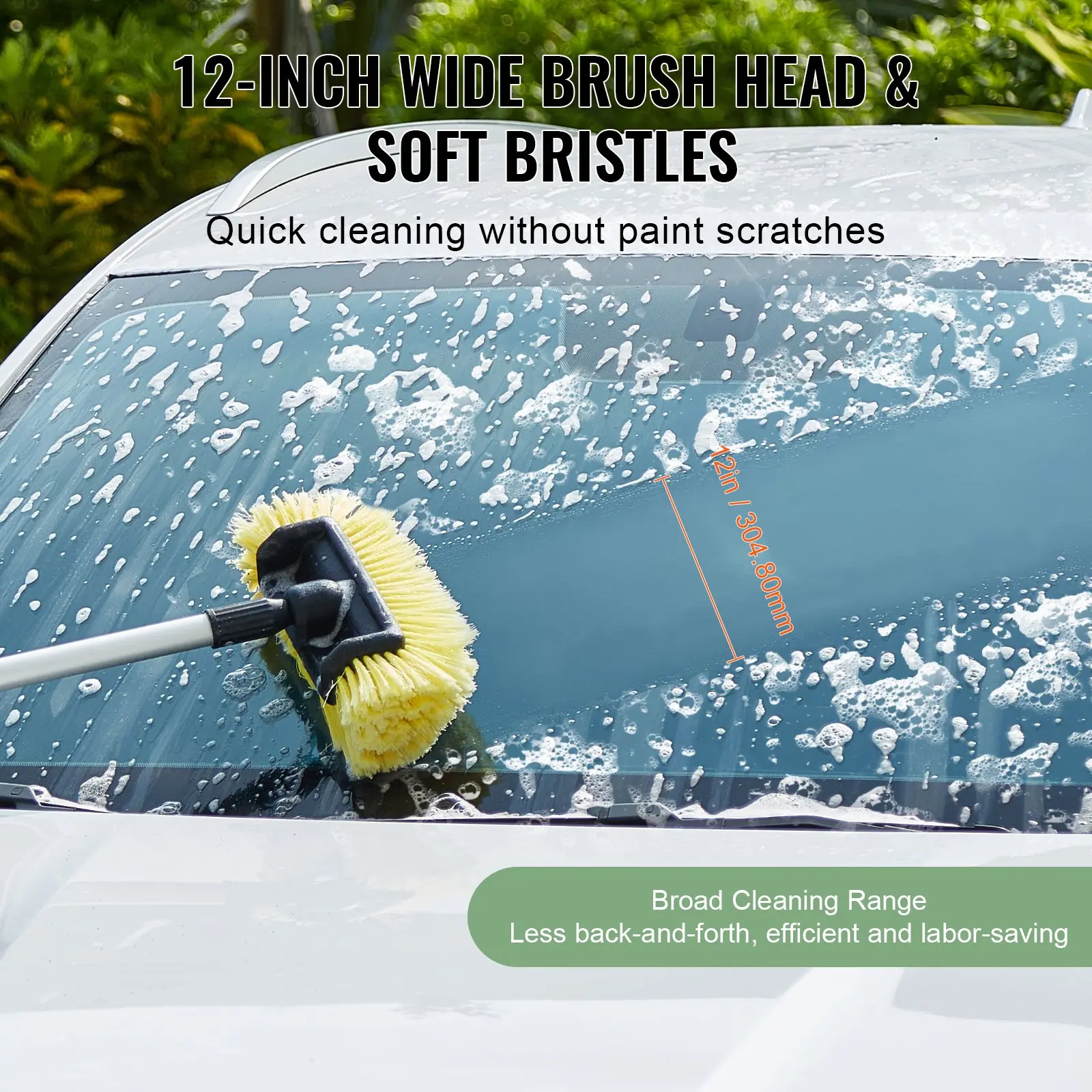 ·Soft Bristle Brush Head: 12-inch wide brush head features soft, high-density PVC bristles that effectively remove stains without scratching car paint. Its 5-sided bristle design fits perfectly into corners, adapting to curves and uneven surfaces to effortlessly scrub away hard-to-reach dirt and stains.
