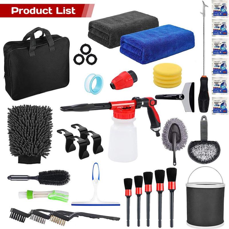 1. Includes almost all items used for the entire car wash and cleaning, as well as some customized popular and useful items. The foam has a new design, and the handle is equipped with a regulator, which can flexibly adjust the water pressure. It makes car washing simple and efficient. Four car headrest hooks are easy to install and quickly organize your car space. 5 detail brushes and other types of brushes to meet all your car detail or cleaning needs.