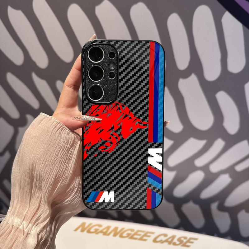 Carbon fiber pattern glass phone case, car logo, for S25, S24, S23, S22, S21, S20, S10, Plus, FE Ultra #SMBGBLKTXW1