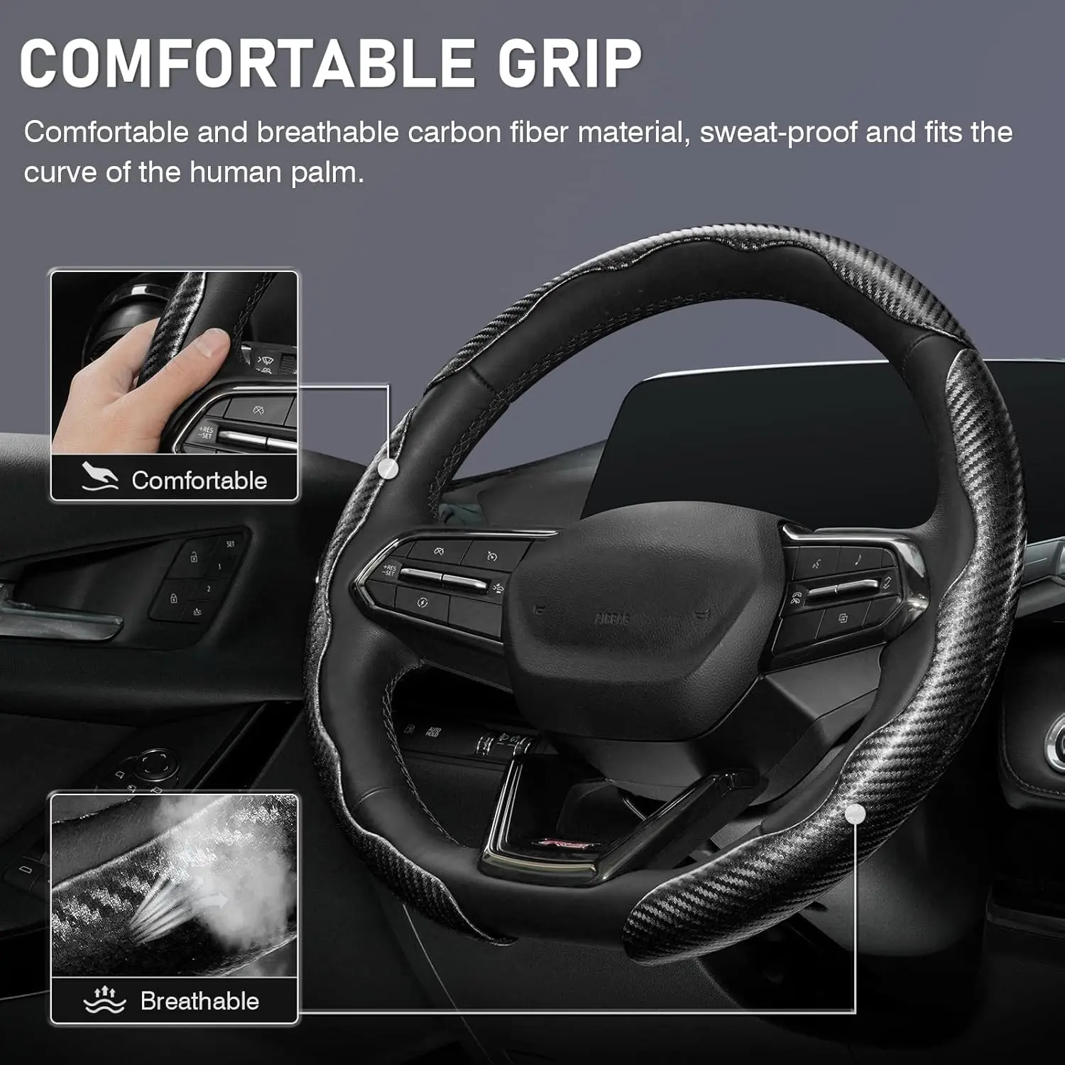 Comfortable Grip 🌟 - Made of high-quality carbon fiber material - Comfortable, breathable, and sweat-proof - Fits the curve of the human palm - No hot hands in summer, no ice hands in winter - Ensures an extremely comfortable grip - Enjoy driving fun