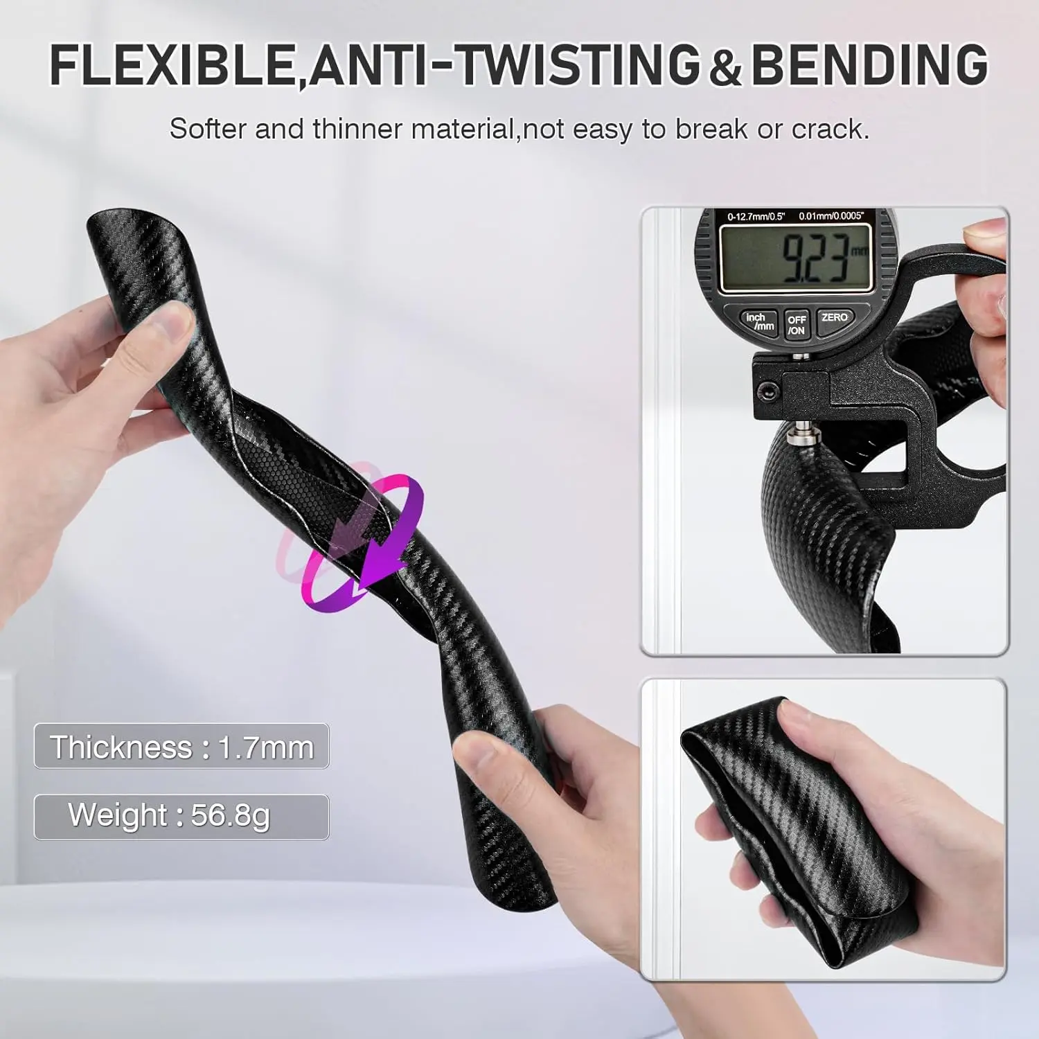 Flexible & Durable 🛠️ - Lighter and softer carbon fiber material - Thickness: 1.7mm - Weight: 56.8g - Precisely fitted with the original steering wheel - Handmade without stitches - Durable and will not break or crack