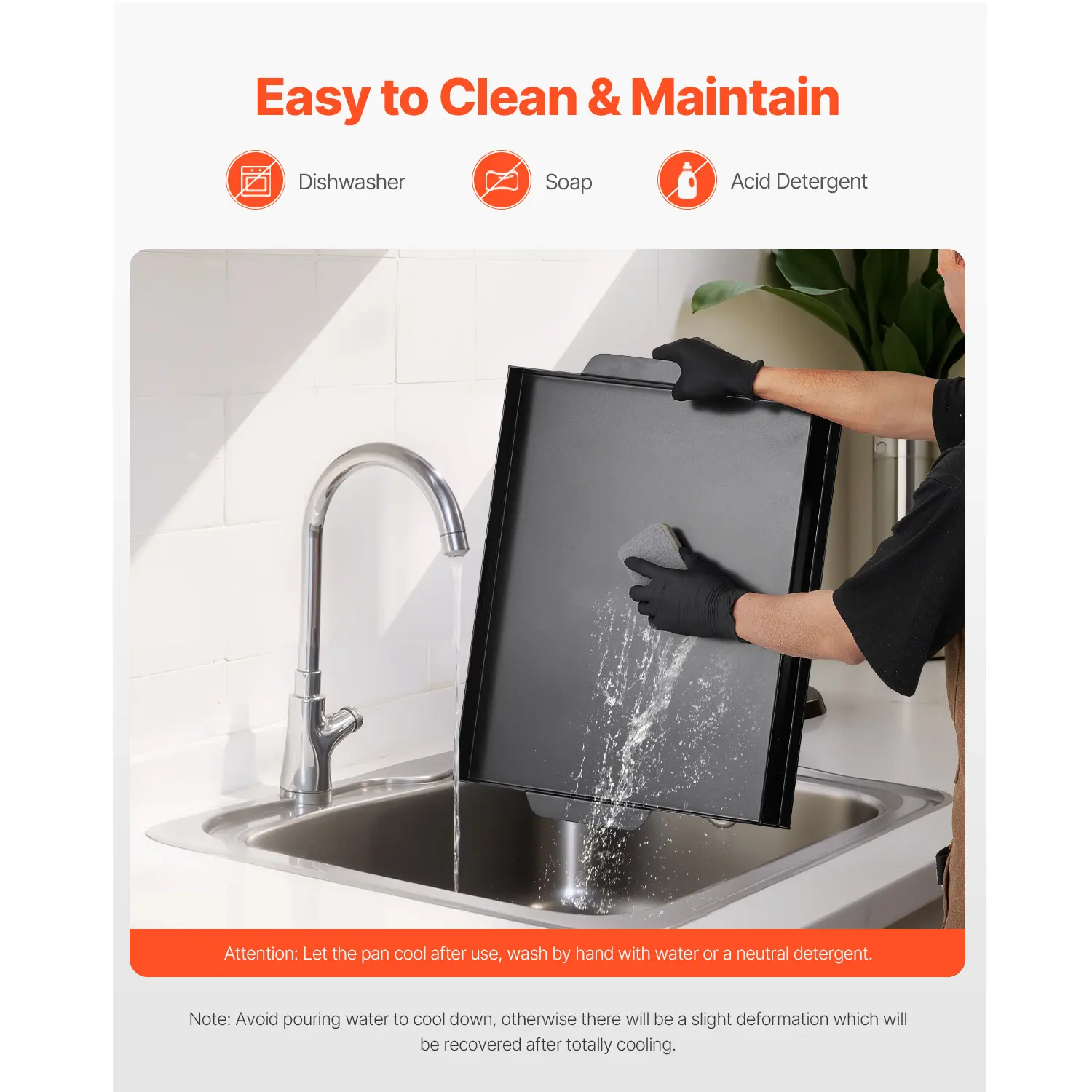 • Quality Carbon Steel: Made from durable carbon steel, this griddle for gas grill can handle temperatures up to 500℉, giving you the freedom to cook at high heat. The bottom x-shaped reinforcement resists to deform
