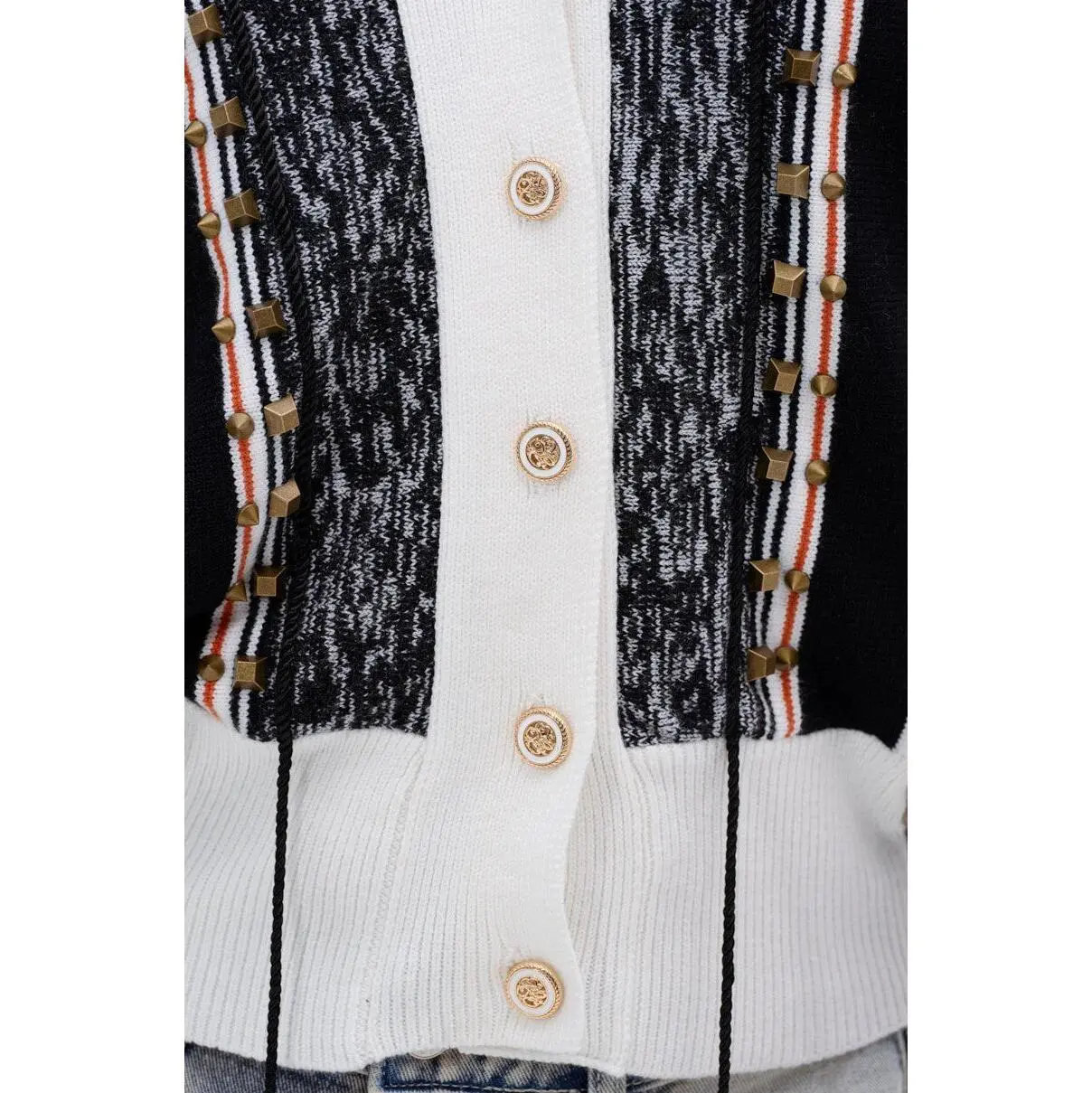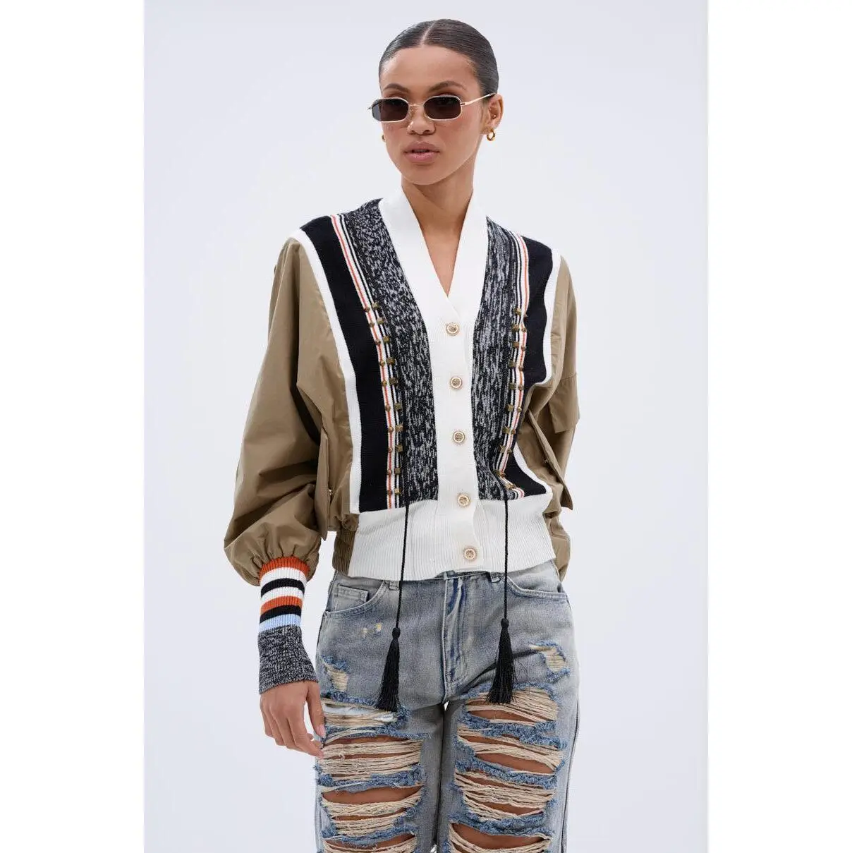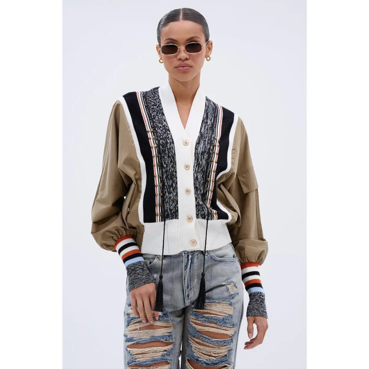 Perfect day, even better outfit. The AKIRA Label Beautiful Day Cardigan is a unique piece boasting a color-blocked, mixed media design. Half swishy jacket, half soft, cozy sweater, this piece features a knit button down front placket with ornate faux gold fastenings, muted gold stud embellishments, and braided tassel attachments. It’s complete with long sleeves featuring mock pockets and striped, ribbed knit cuffs, an elasticized hemline, and spacious waist pockets with snap-button closures. - Main: 65% Cotton, 32% Nylon, 3% Spandex, Trim: 50% Viscose, 27% Nylon, 23% Polyester- Super Stretchy - Imported(all measurements approximate from size small) - 22” Shoulder to Hem- 16” Shoulder to Shoulder- 26.5” Sleeves- Model is 5’8” and wearing a size smallProduct ID: 441331