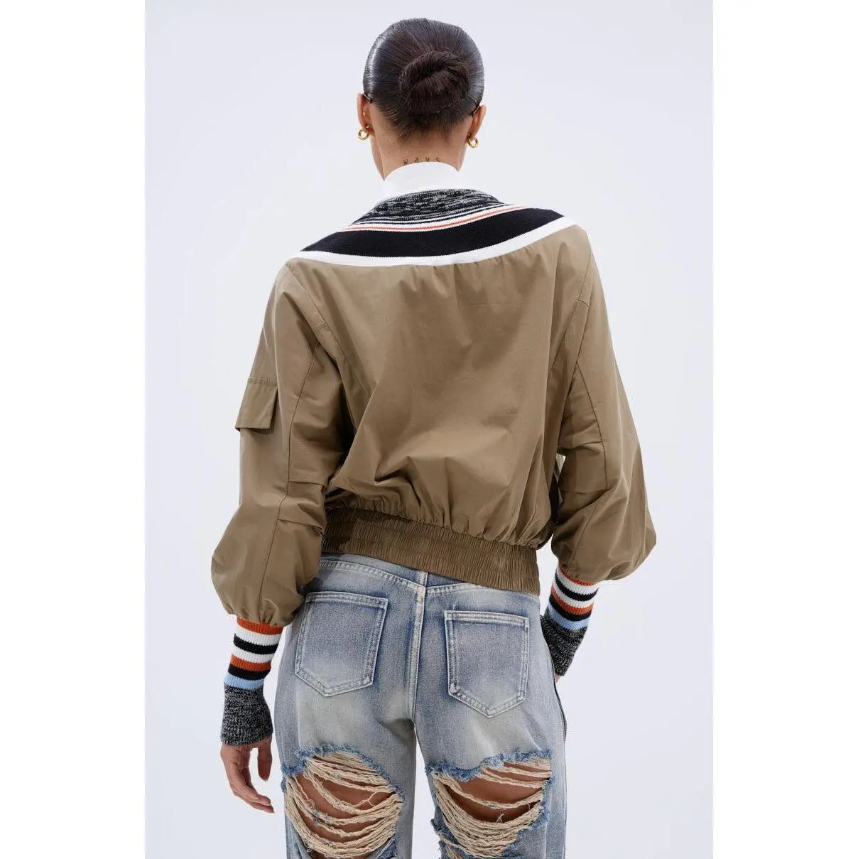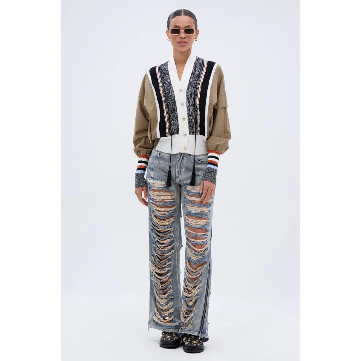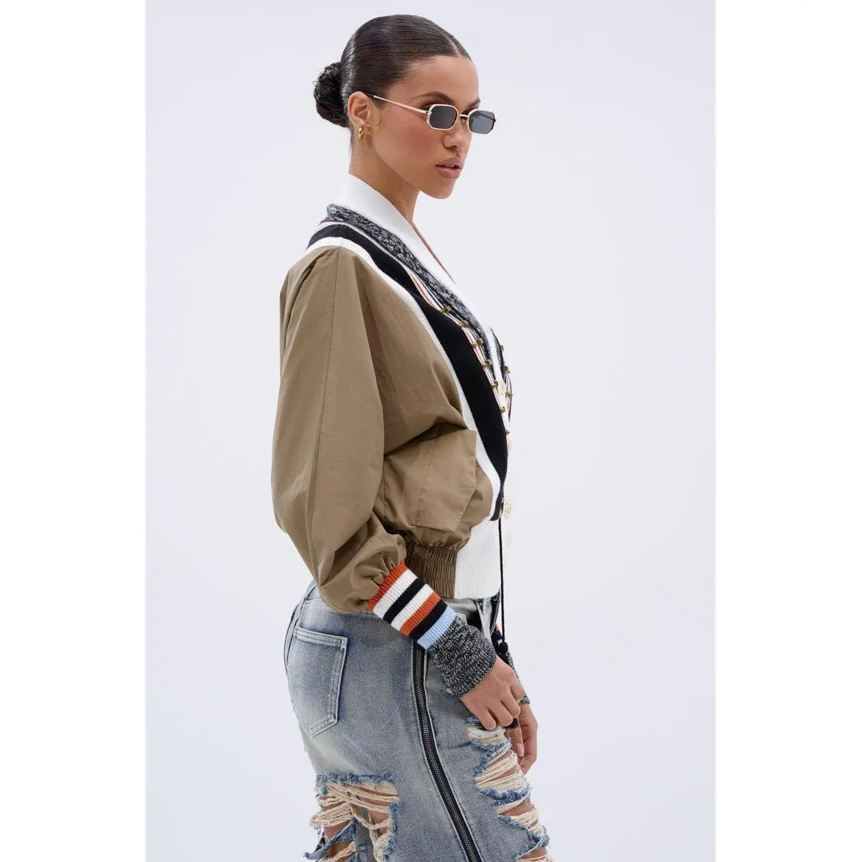 Perfect day, even better outfit. The AKIRA Label Beautiful Day Cardigan is a unique piece boasting a color-blocked, mixed media design. Half swishy jacket, half soft, cozy sweater, this piece features a knit button down front placket with ornate faux gold fastenings, muted gold stud embellishments, and braided tassel attachments. It’s complete with long sleeves featuring mock pockets and striped, ribbed knit cuffs, an elasticized hemline, and spacious waist pockets with snap-button closures. - Main: 65% Cotton, 32% Nylon, 3% Spandex, Trim: 50% Viscose, 27% Nylon, 23% Polyester- Super Stretchy - Imported(all measurements approximate from size small) - 22” Shoulder to Hem- 16” Shoulder to Shoulder- 26.5” Sleeves- Model is 5’8” and wearing a size smallProduct ID: 441331