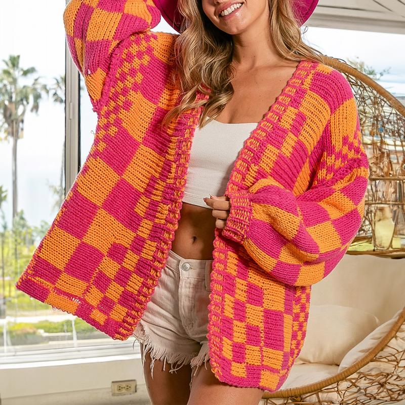 ¡Stay cozy and chic with our Comfy Open Front Mixed Checkered Pattern Knit Cardigan.