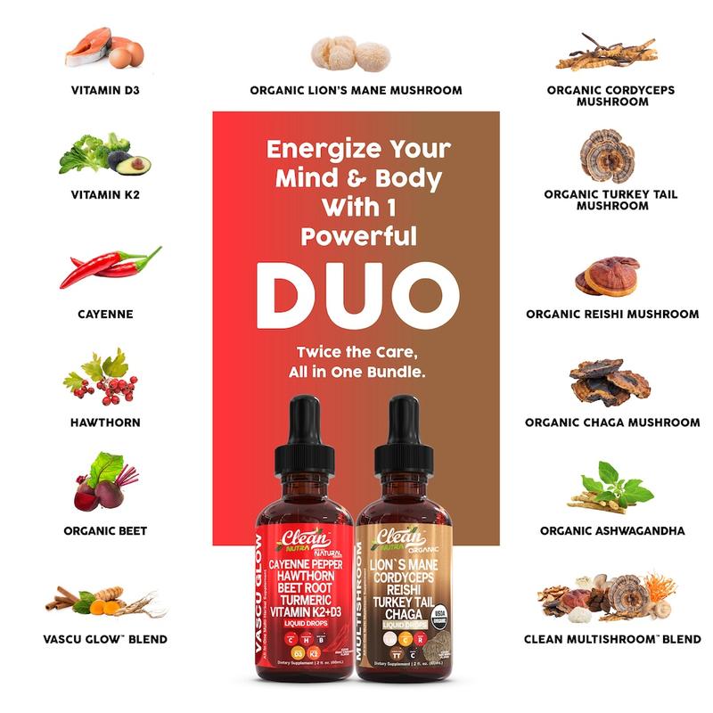 Fuel both your body and mind with Clean Nutra’s Cardio Clarity Duo. This targeted 2-in-1 wellness bundle supports heart function and mental performance. Vascu Flow helps promote healthy blood flow and circulation, while MultiShroom Drops deliver an adaptogenic mushroom blend for brain health and daily focus. Designed for those who want more clarity, energy, and balance—starting from within.