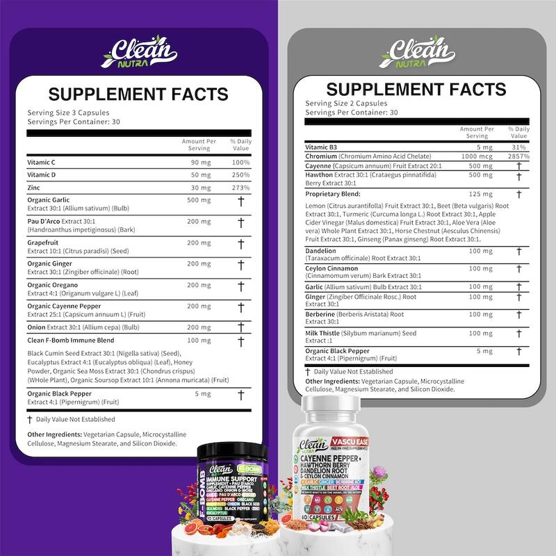 Defend your core systems with the Clean Nutra CardioDefend Duo, a two-part formula supporting cardiovascular health, immune strength, and daily vitality. Powered by heart-healthy ingredients like Hawthorn Berry, Cayenne Pepper, and Turmeric, paired with a robust immune blend featuring Garlic, Zinc, Vitamin C, and Black Seed, this combo keeps your body fortified from the inside out.