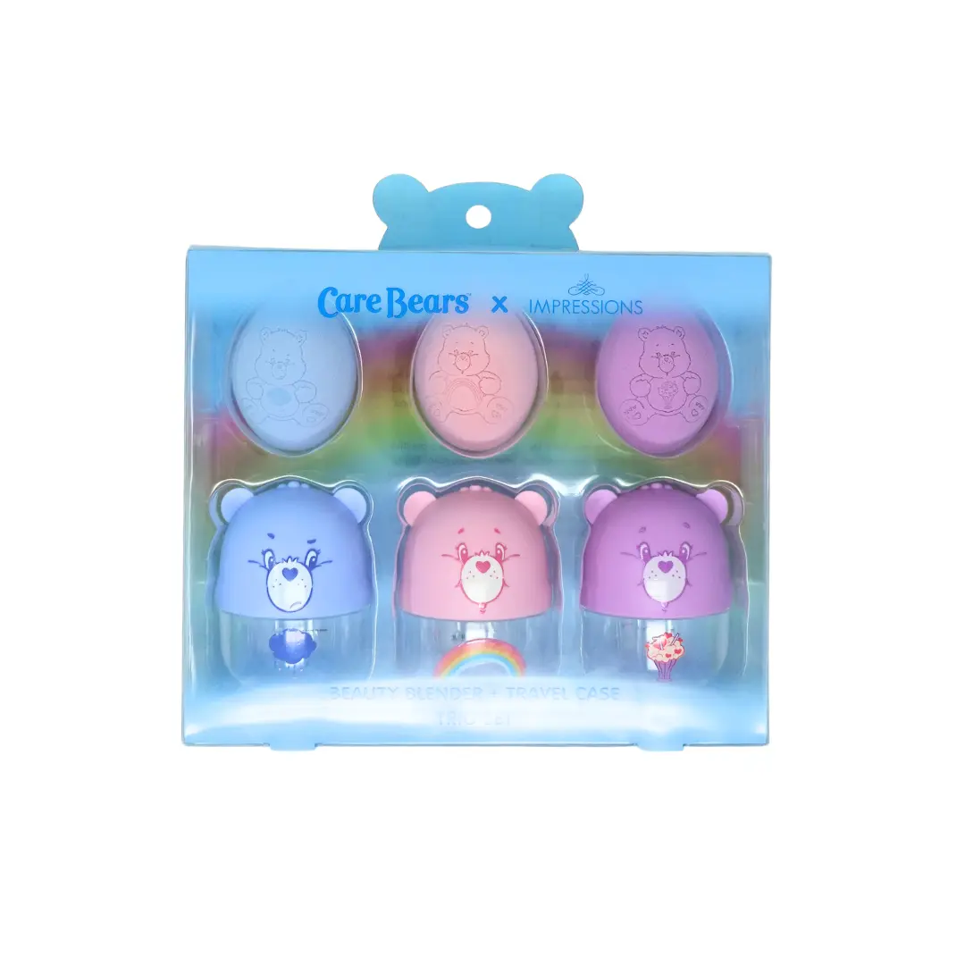 Care Bears blending sponge trio with matching travel cases featuring adorable Care Bear artwork and 3D ears, perfect for cute and functional makeup application. Soft beauty sponges for seamless foundation, concealer, and cream products, ideal for on-the-go touch ups, travel makeup bags, vanity décor, Care Bears fans, nostalgic beauty lovers, and collectible beauty tools. #CareBears #impressionsvanity #tiktokshopcreatorpicks #carebearsmakeup