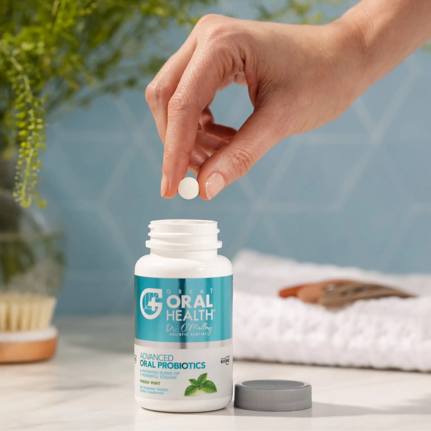 Chew two tablets nightly before bed—no rinsing required—to let the beneficial bacteria colonize your mouth and throat while you sleep.