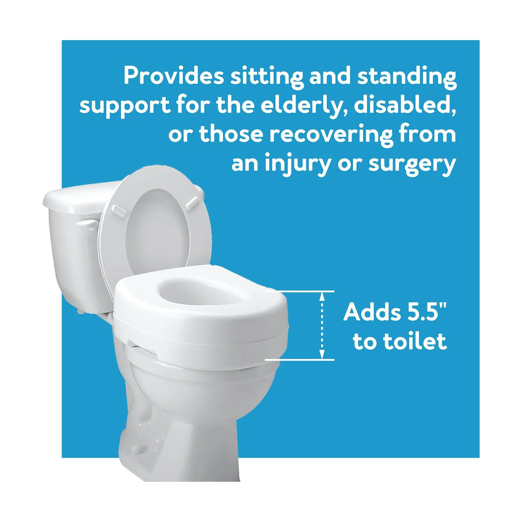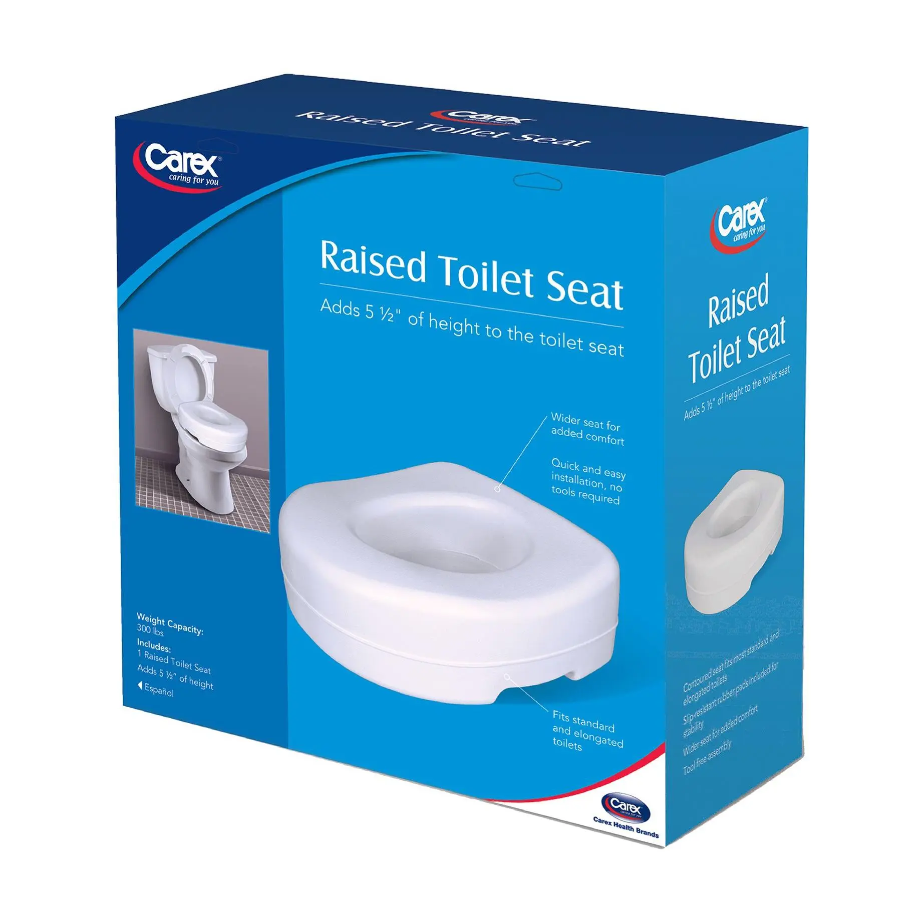 Elevate your bathroom experience with the Carex raised toilet seat. Perfect for those with bending or sitting difficulties, it adds 5"H to standard and elongated toilets, ensuring a comfortable and secure seating area. From Carex.