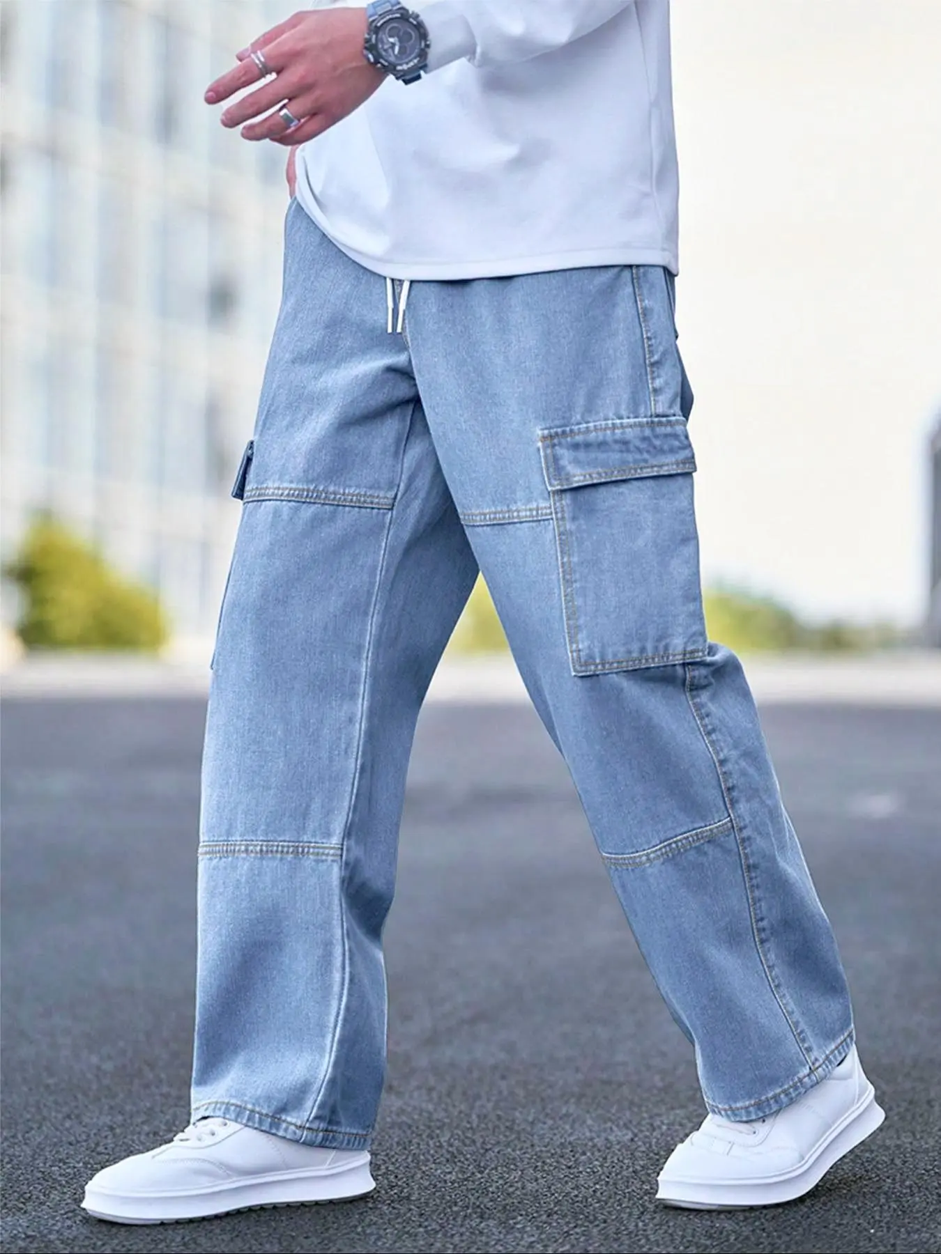 5. Men's Solid Flap Pocket Cargo Jeans, Loose Casual Street Fashion Denim Pants for Daily Wear, Men's Trousers for All Seasons, Streetwear