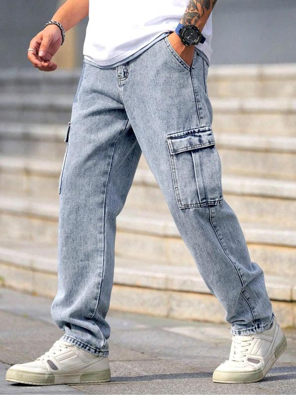 Men's Solid Color Washed Straight Leg Cargo Jeans, Loose Casual Comfy Flap Pocket & Slant Pocket Design Denim Trousers for Daily Wear, Fashion Men's Bottoms for All Seasons, Cotton, Relaxed Fit Jeans, Baggy Jeans, Pants
