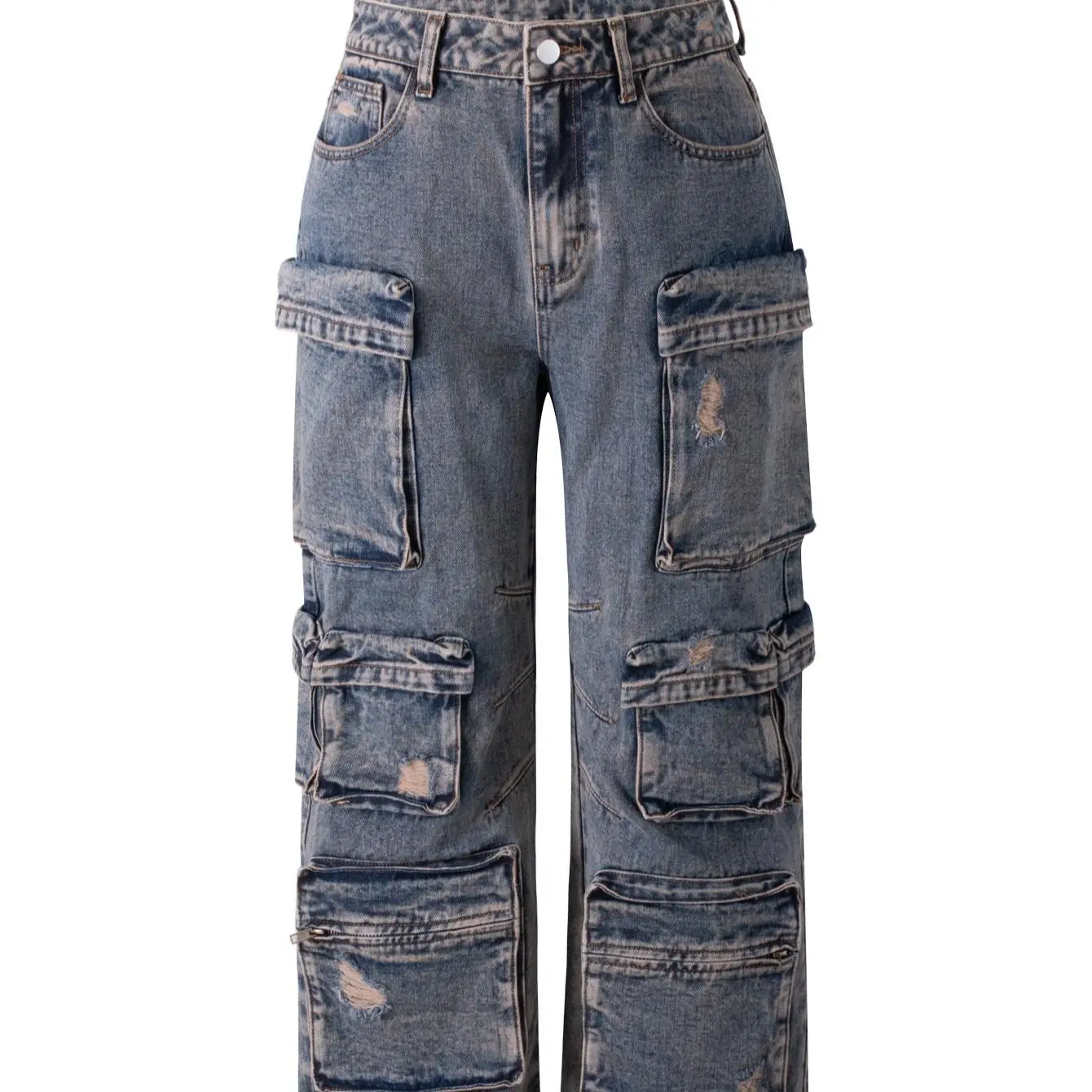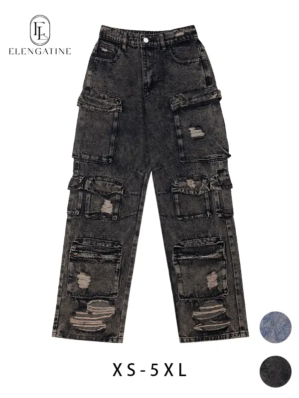 โจ Elevate your casual style with Elengatine's FallFreshness 13 Pockets Casual Chic High Waisted Loose Fit Straight Leg Cargo Jeans. These vintage-inspired distressed denim pants feature multiple utility pockets and a loose wide-leg style. Perfect for a relaxed, chic look. ๐ฟ