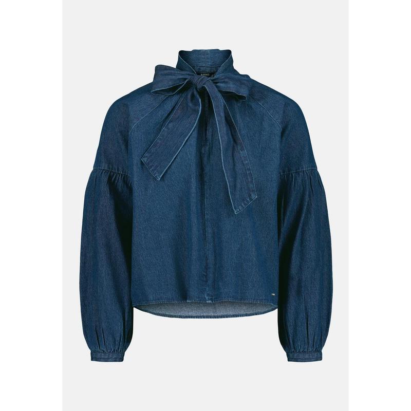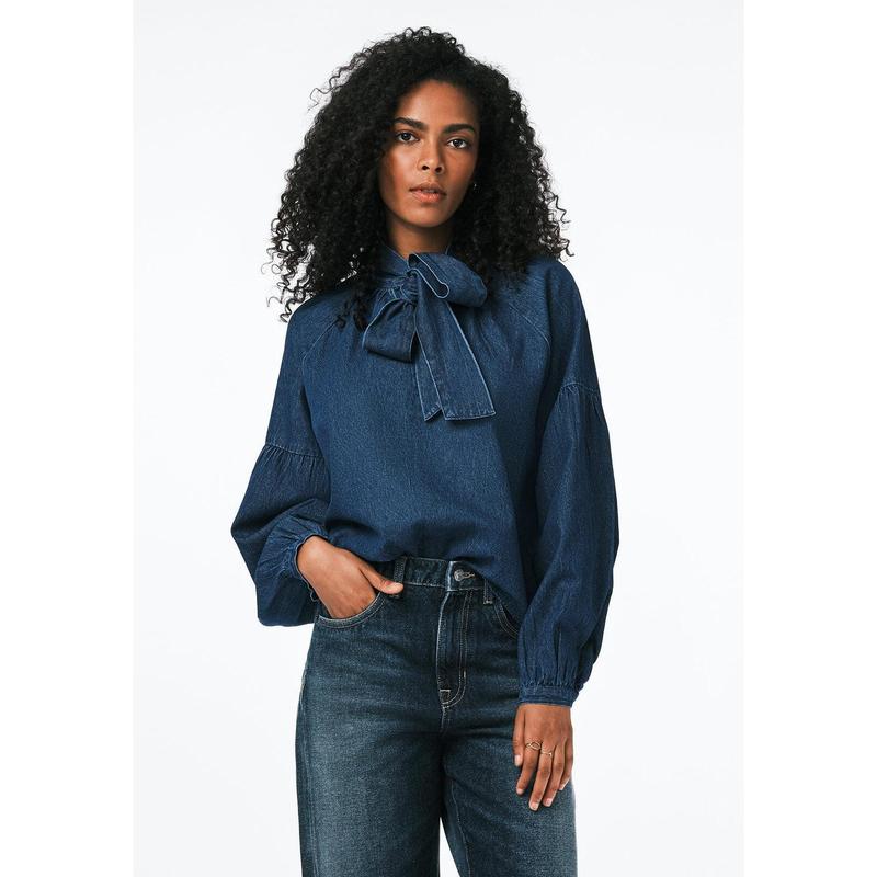The Carissa denim blouse features a statement bow tie neckline, voluminous long sleeves with gathered seams, and a relaxed silhouette crafted from soft-washed denim. Designed for versatile wear, this elevated top balances classic tailoring with modern femininity—ideal for pairing with jeans, trousers, or skirts for effortlessly chic styling.