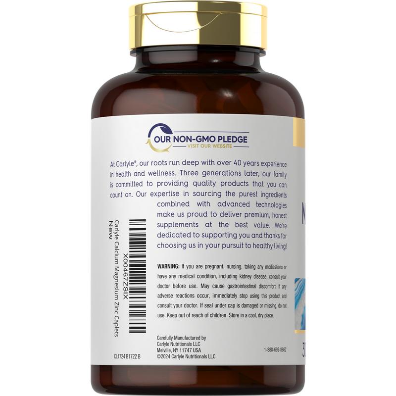ย Carlyle Calcium Magnesium Zinc: Carlyle Calcium Magnesium Zinc is a powerful source of these three major minerals, supplying 1,000 mg of Calcium, 400 mg of Magnesium, and 15 mg of Zinc per serving in one premium, vegetarian blend. Coated caplets provide high absorption, making this gluten-free and non-GMO formula a top choice to support a healthy lifestyle. Men and women can enjoy the ultimate value now with our 300-caplet bulk supply!