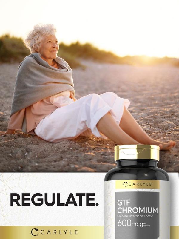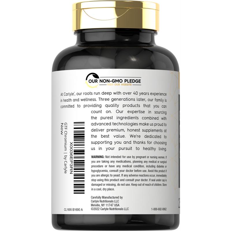 Essential Trace Mineral Support: Everybody knows the importance that minerals play in supporting a healthy routine. However, what you may not know is that essential minerals like Chromium cannot be produced by the body. Chromium must be obtained from mineral rich foods or a nutritional supplement such as liquid, powder, tablets, and capsules! Carlyle GTF Chromium: At Carlyle, we used advanced research and expert sourcing to bring you a superior quality source of Chromium. Our gluten-free and non-GMO formula delivers 600 mcg per serving of Chromium (as GTF Chromium) in quick-release capsules for trace mineral support. We test our supplements for purity and potency down to each individual ingredient, ensuring nothing short of excellence you can rely on every day.  Rooted in Wellness: Our expertise in sourcing the purest ingredients combined with advanced technologies makes us proud to deliver premium, honest supplements at the best value. Carlyle GTF Chromium is a testament to our commitment to excellence, made with powerful ingredients rooted in wellness. Thanks for choosing us in your pursuit of living healthy.
