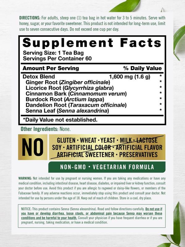 Each cup of tea contains a refreshing medley of traditional herbs, featuring Ginger, Dandelion Root, and Senna Leaf. Our vegetarian formula is gluten-free, non-GMO, and caffeine-free, making it a delightful drink to enjoy any time of day.