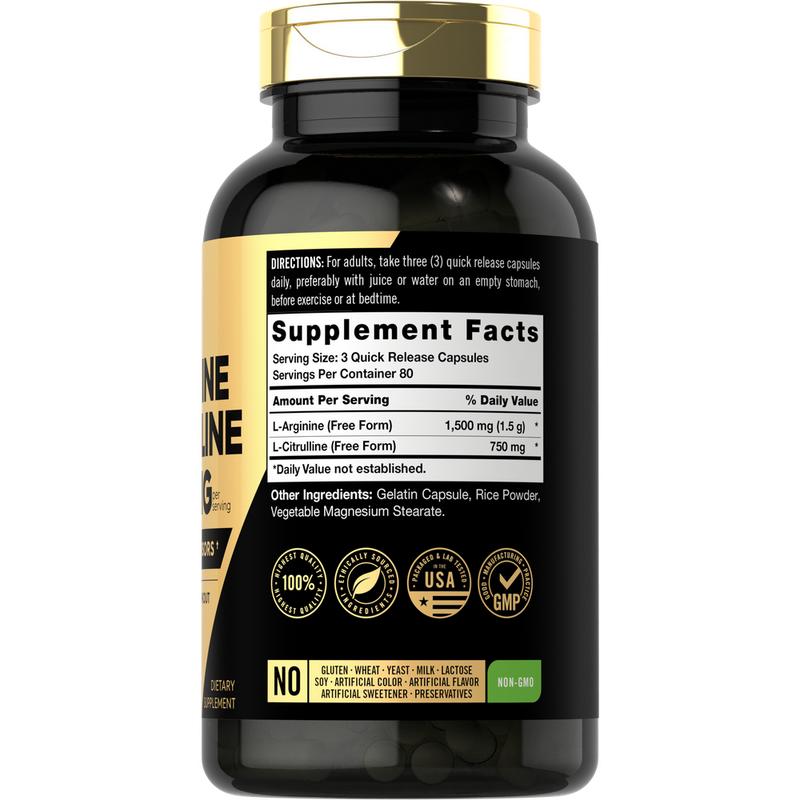 Our formula delivers 1,500 mg of L-Arginine and 750 mg of L-Citrulline per serving in convenient quick release capsules. This formula is a nitric oxide precursor and can be taken pre or post workout to support your fitness routine.** Men and women can take three quick release capsules each day with juice or water.