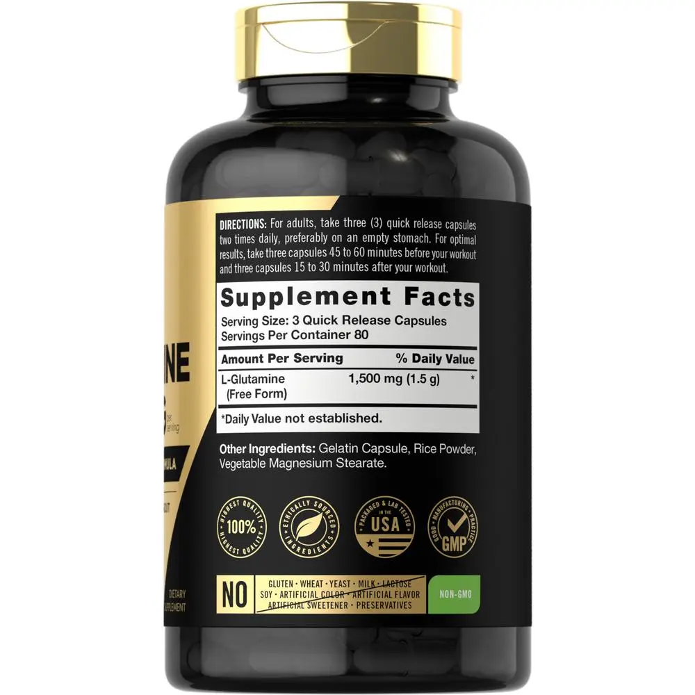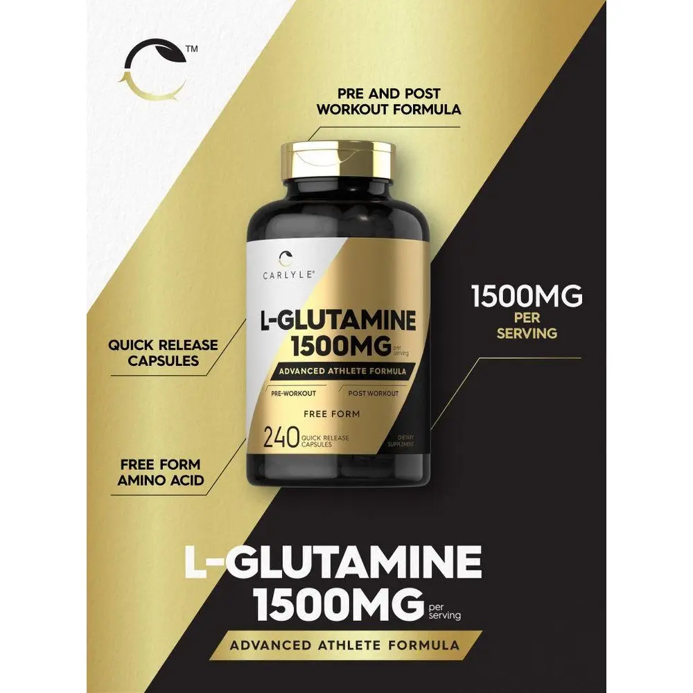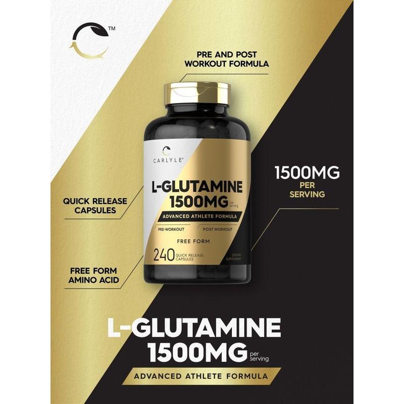 Carlyle L-Glutamine is the optimum supplement for your workout regimen. This advanced athlete formula delivers 1,500 mg of free form L-Glutamine per serving. It is gluten-free, non-GMO and easy to take pre or post workout with quick-release capsules.