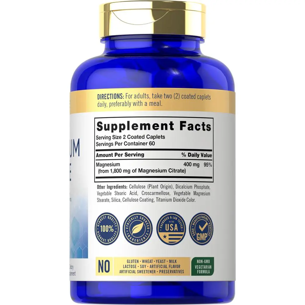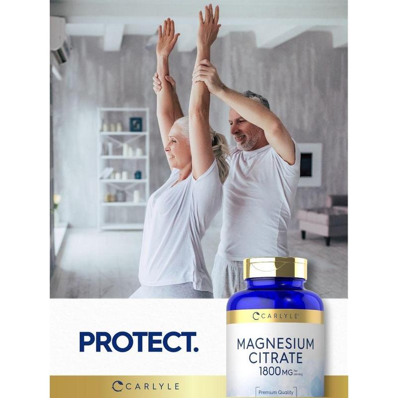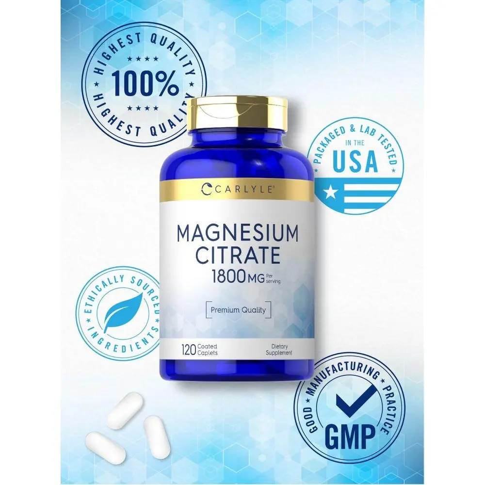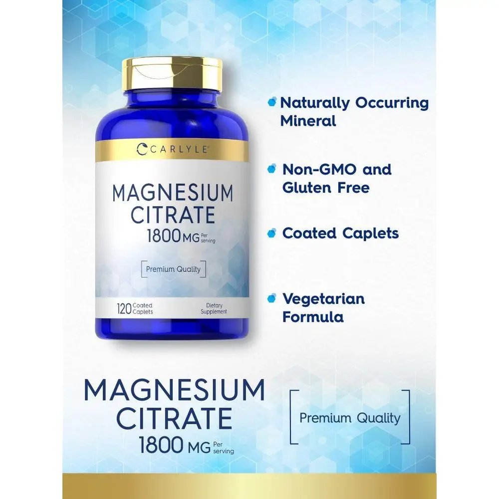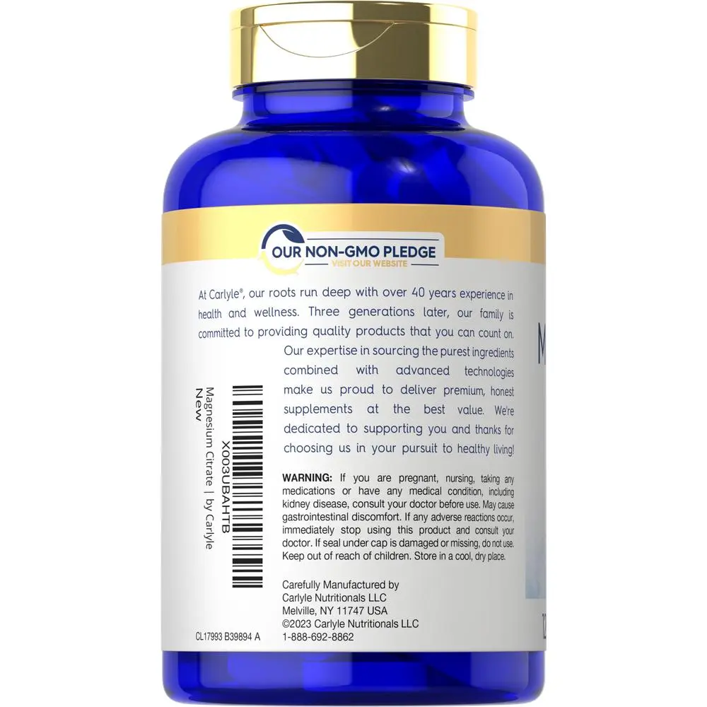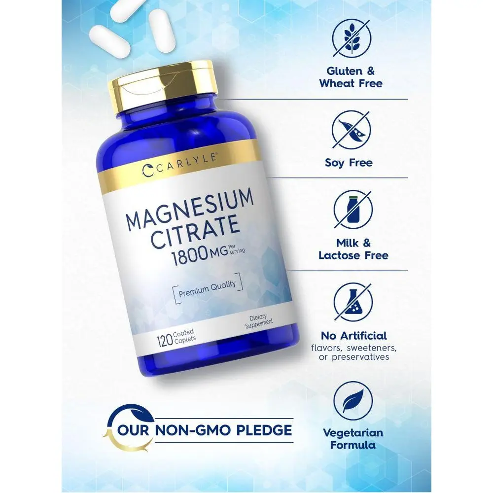Carlyle's convenient coated caplets feature 1,800 mg Magnesium Citrate per serving. Our advanced formula is gluten-free, non-GMO, and naturally free of preservatives, making it an easy addition to your vitamins and supplements collection. Get exceptional value now with our 120-caplet supply!