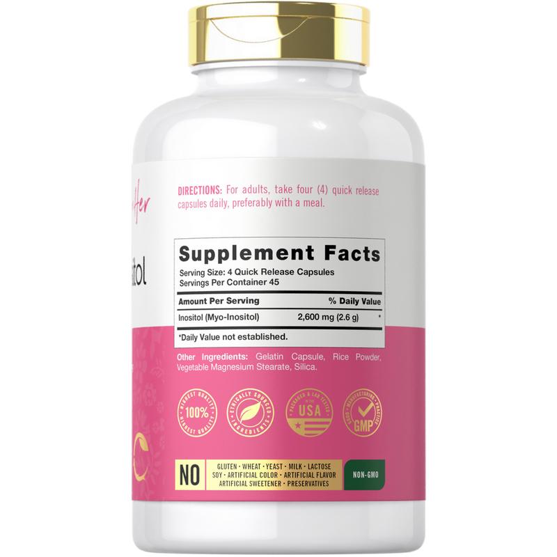 Carlyle Myo-Inositol features 2,600 mg per serving of this substance in convenient quick-release capsules. Our gluten-free and non-GMO formula contains no artificial color, artificial flavor, or preservatives. Try Myo-Inositol today and receive exceptional nutritional support with our 180-capsule supply.