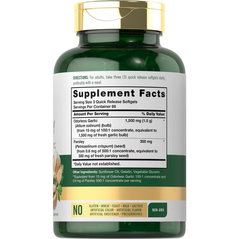 Carlyle Odorless Garlic & Parsley: Spice up your routine with Carlyle Odorless Garlic & Parsley! Our premium herbal supplement lets you reap  the benefits of Garlic without any of the harsh odor that comes from consuming it. Each serving delivers the equivalent of 1,500 mg of Garlic plus Parsley extract, all in convenient, quick-release softgels. We test our herbs for purity and potency, always bringing you the best quality you deserve.