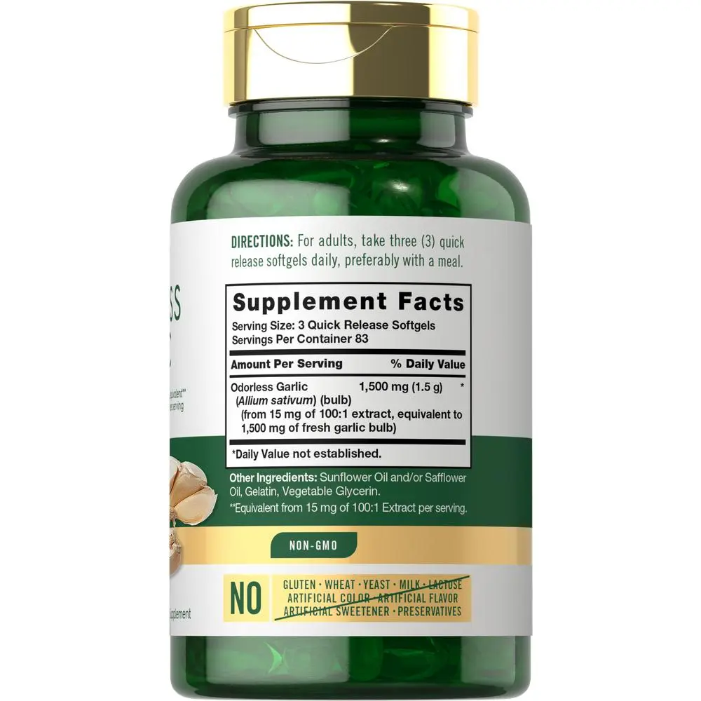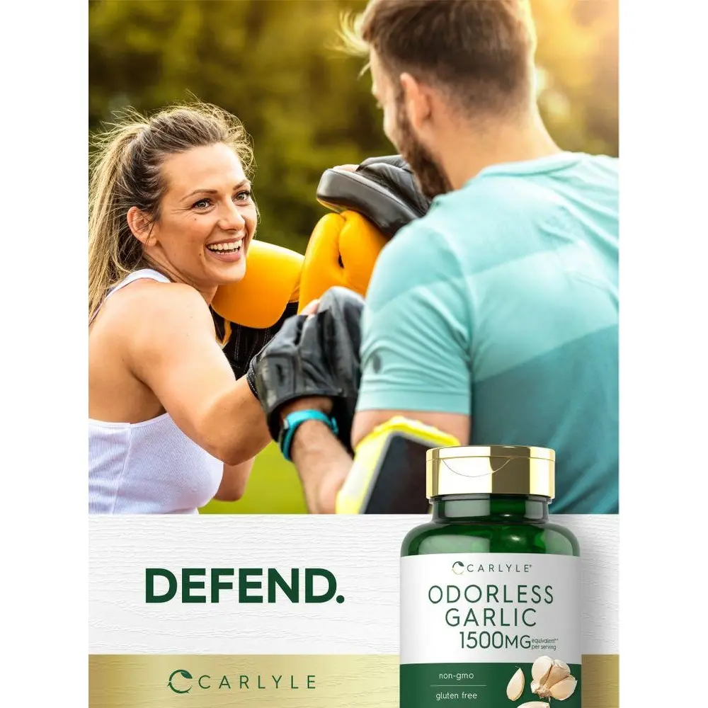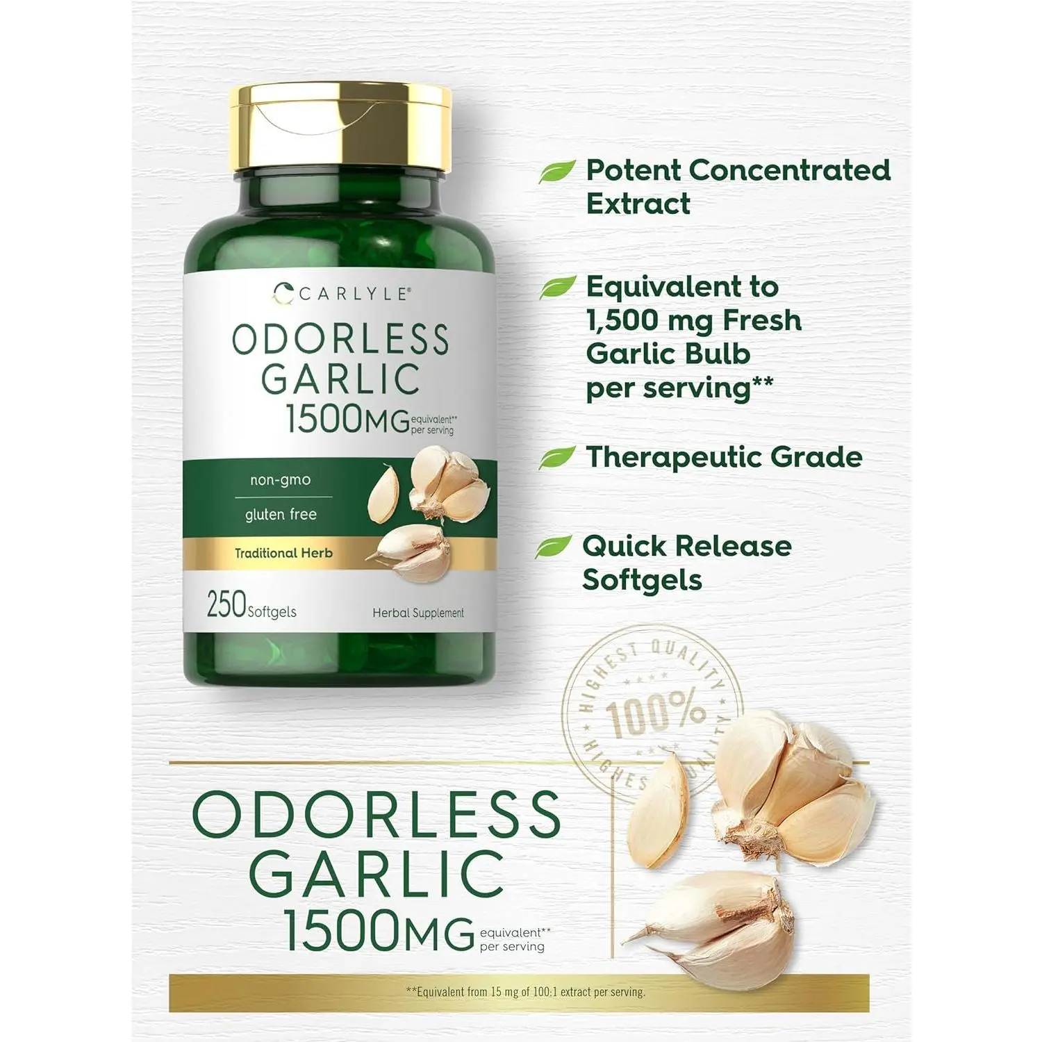 Now enjoy the benefits of Garlic without any harsh taste or odor! At Carlyle, our special formula is made with deodorized Garlic extract, an odorless form that doesn't cause unwanted bad breath. Quick-release softgels deliver the equivalent of 1,500 mg of Garlic per serving, the highest quality source of this spice for your supplement routine.