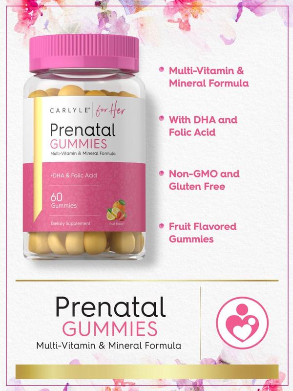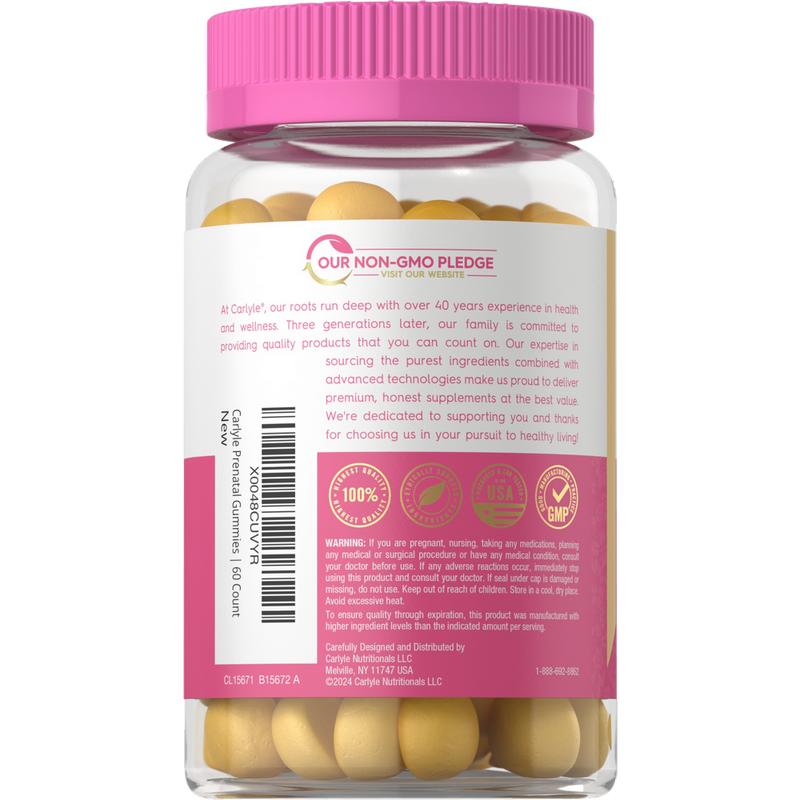 With Carlyle's Prenatal fruit flavored Gummies, nutrition is one less thing to worry about! Our Multi-Vitamin and Mineral formula provides beneficial nutrients including Vitamins A, B, C, D, E, Zinc, DHA, Folic Acid, and more! It's gluten free and non-GMO, making it a popular supplement of choice for women everywhere!
