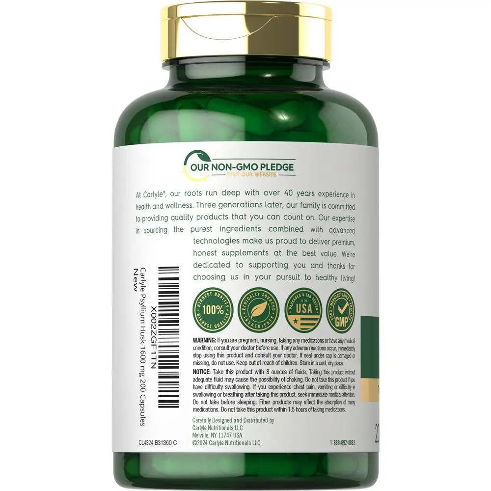 Nature’s Premium Fiber Source: Psyllium Husk is the most premium source of fiber nature can provide, derived from the seeds of the Plantago ovata plant. Psyllium Husk contains a high concentration of bulk-forming soluble fiber, the preferred form of fiber for nutritional support. Psyllium can be found in the form of powder, pills, gummies, tablets, and more. Looking for the finest source of Psyllium Husk to add to your herbal wellness routine? Carlyle Psyllium Husk Supplement: Carlyle Psyllium Husk is nature’s premium source of plant-derived fiber. Our gluten free and non-GMO formula offers 1,600 mg of Psyllium Husk per serving in quick release capsules, a source of soluble fiber for powerful nutritional support. Enjoy excellent value on our 200-capsule supply from your number one source of herbal supplements, Carlyle Nutritionals. Carlyle Psyllium Husk — Rooted in Wellness: Our expertise in sourcing the purest ingredients combined with advanced technologies makes us proud to deliver premium, honest supplements at the best value. Our Psyllium Husk supplement is a testament to our commitment to excellence, made with powerful ingredients rooted in wellness. Thanks for choosing us in your pursuit of living healthy!