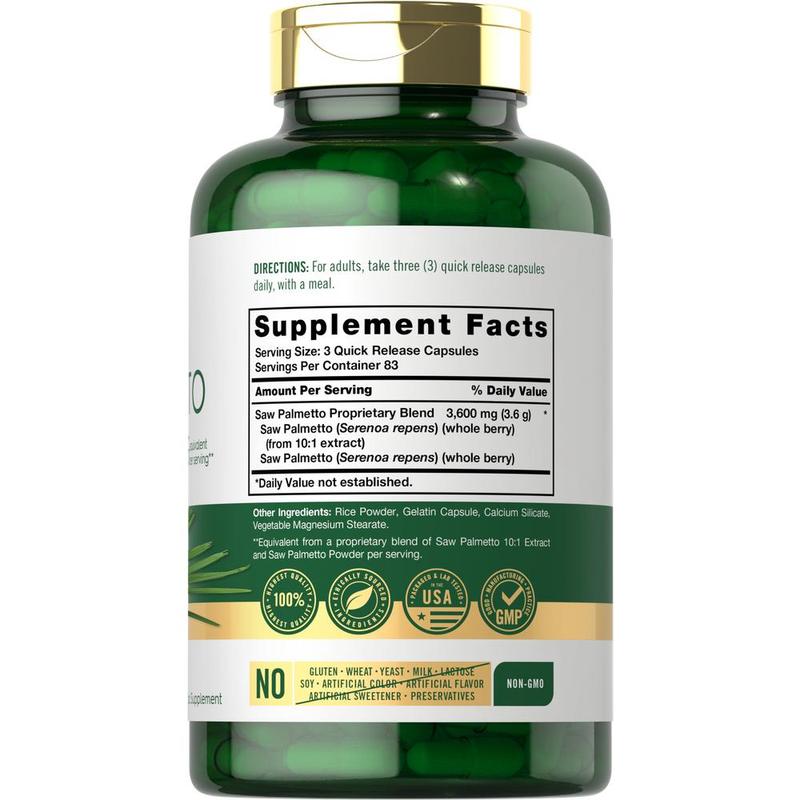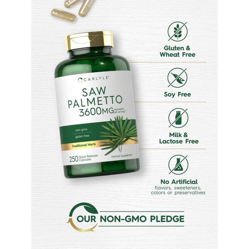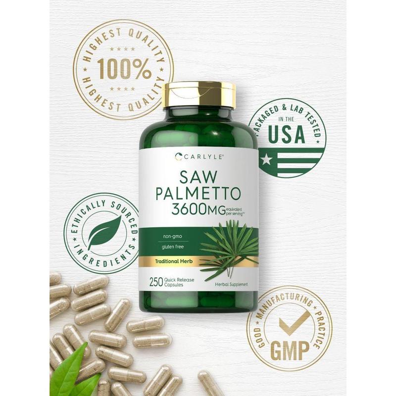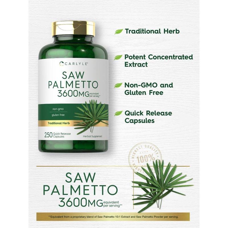 Experience this traditional herb with Carlyle Saw Palmetto! Our advanced formula delivers a Saw Palmetto Proprietary Blend equivalent to 3,600 mg per serving in convenient quick release capsules. It's non-gmo and gluten free, made with no artificial flavor, sweetener or preservatives, making it the perfect addition to any vitamins and supplements collection!