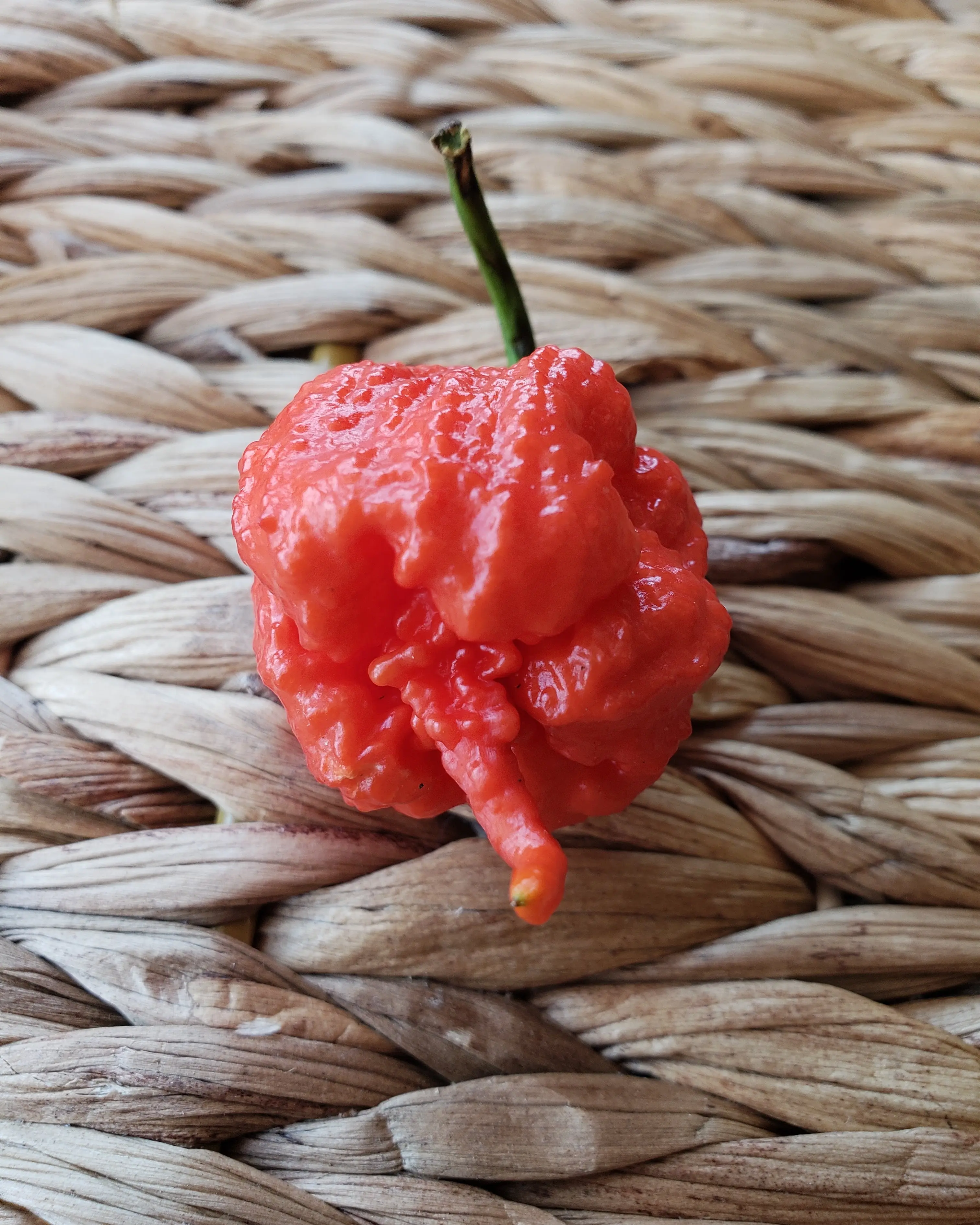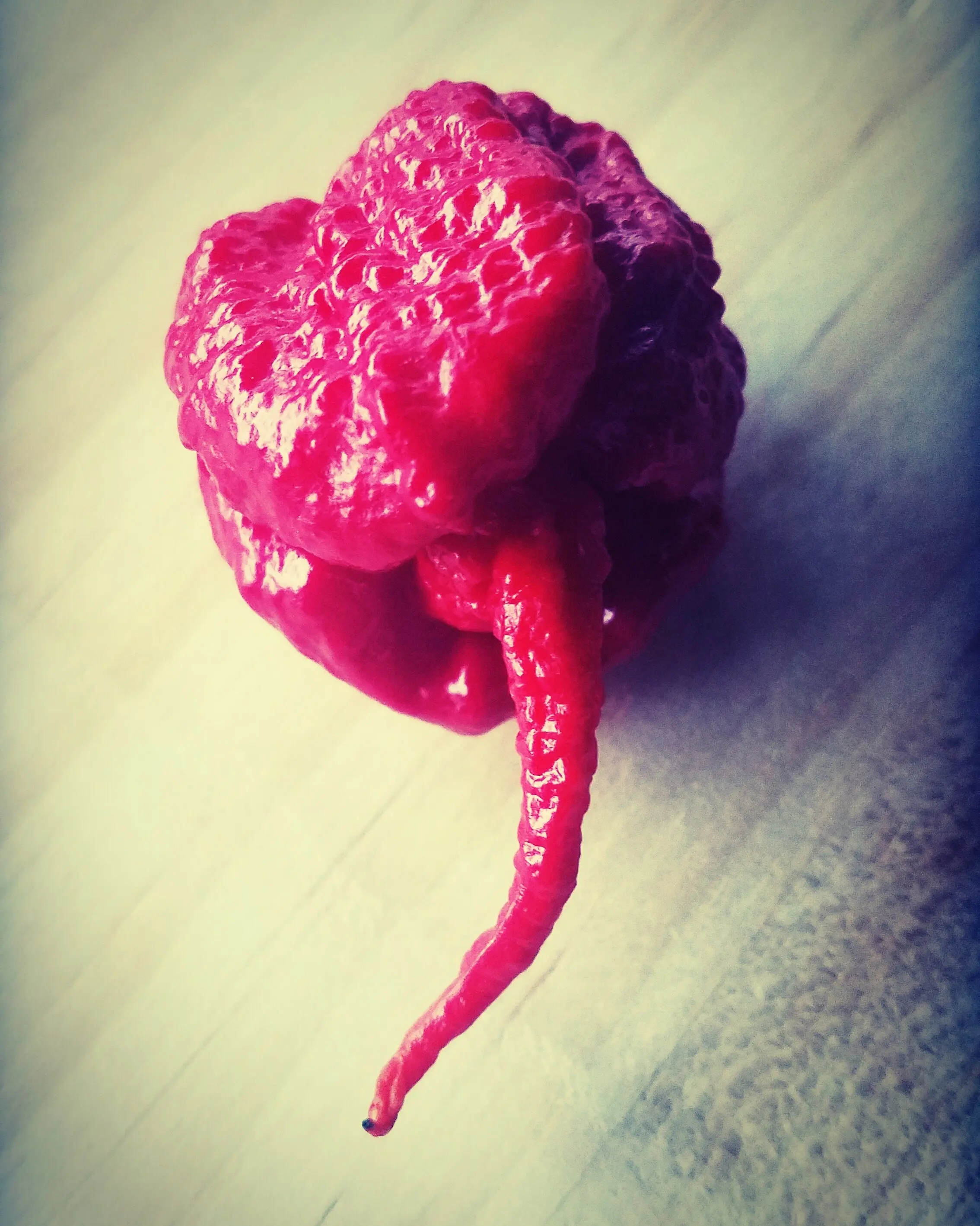 This pepper is beautiful bright red with a rough surface and a long stinger. But don't let its good looks fool you! This pepper got its name for a reason. If you are "stupit" enough to eat this pepper whole you may wish to enter the doors of death willingly! Be very, very careful using this pepper. Those who don't fear the Reaper are fools. Its Scoville rating is 1,641,300 SHU. Flavor has been described as sweet, fruity, with a hint of cinnamon with chocolate undertones. Uses include hot sauces, salsas, cooking, settling old scores and combat.