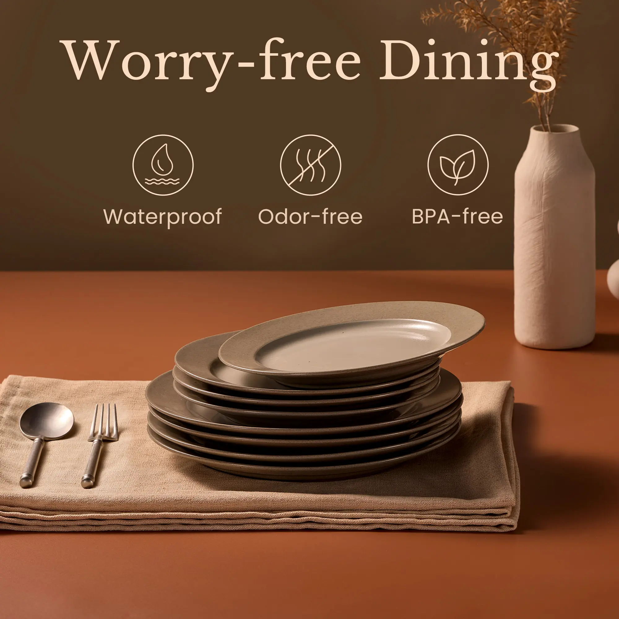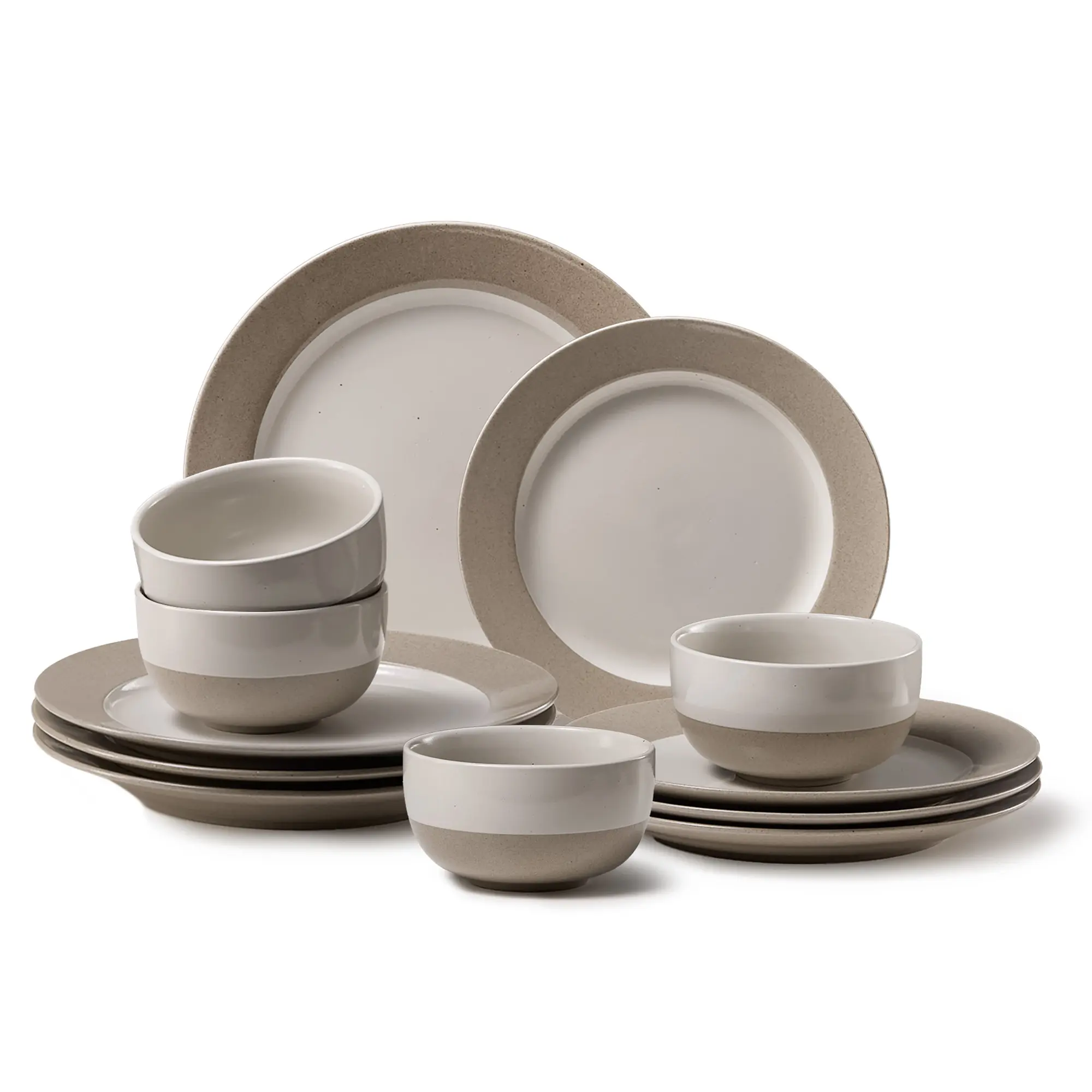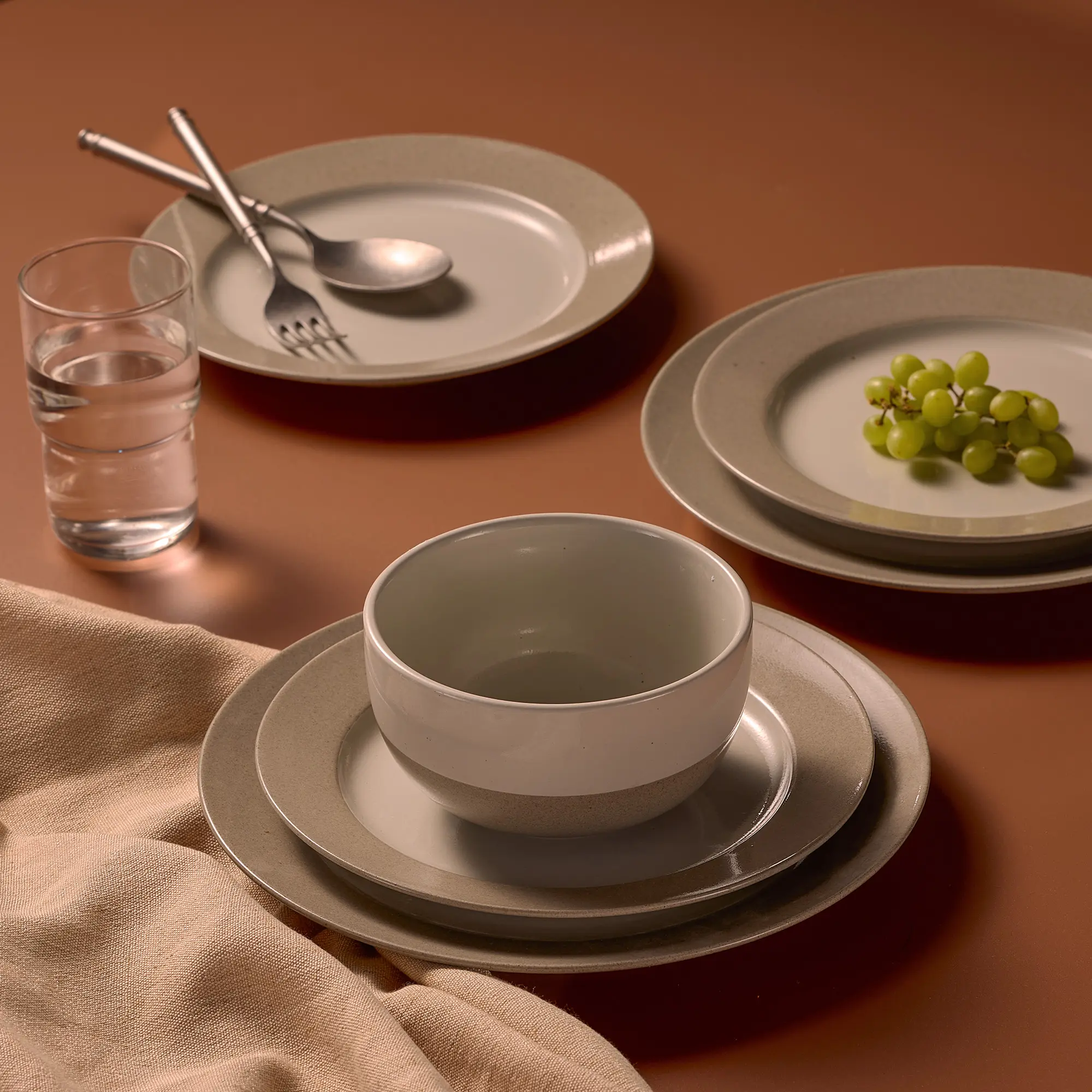 A calming base of warm beige is artfully accented with contrasting tones, creating a modern, layered look. This versatile palette complements any dining decor, from minimalist to rustic, transforming every meal into a stylish occasion.