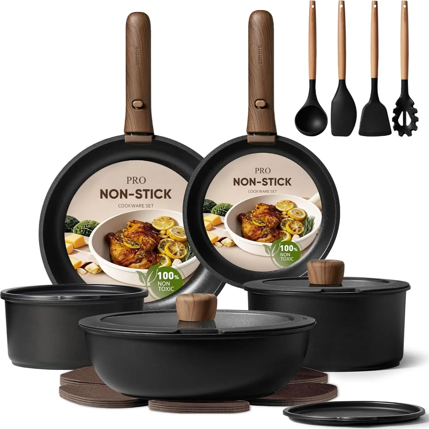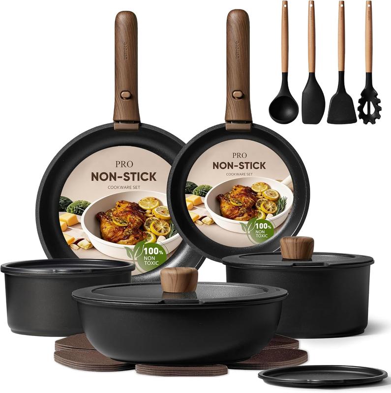 19-Piece Set:8" fry pan, 10" fry pan, 2-qt saucepan, 3-qt saucepan, 4-qt sauté pan, 8''/10'' silicone lid, 2*removable handles, 4* pan protector, 7''/8'' food storage lids, 4*utensil set