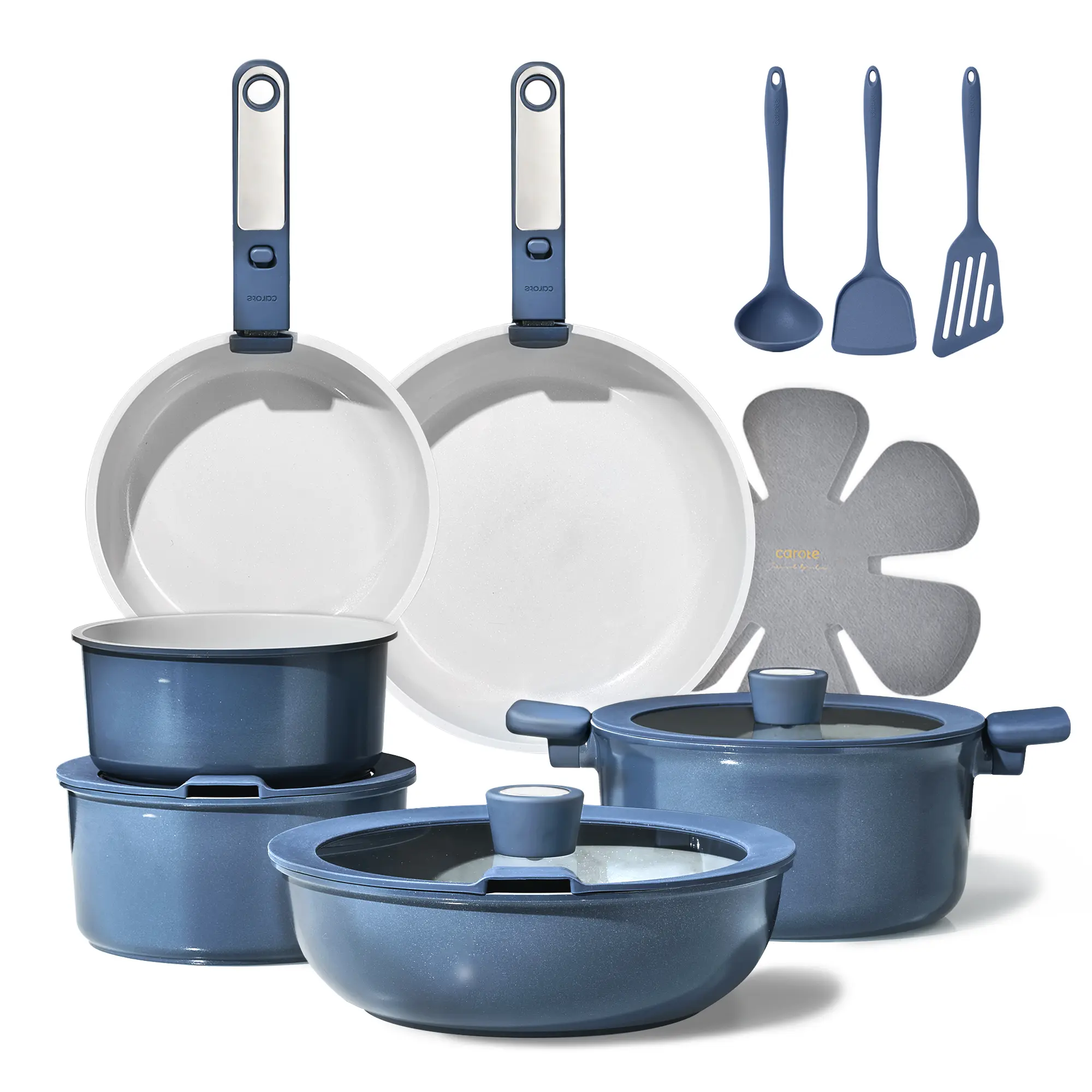 This 19Pcs set Includes: 8'' frying pan, 10'' frying pan, 3.5-qt saute pan with lid, 2-qt saucepan, 3-qt saucepan with lid, 4.5-qt casserole with lid, 2*detachable handle, 3pcs utensil set and 5pcs pan protectors.