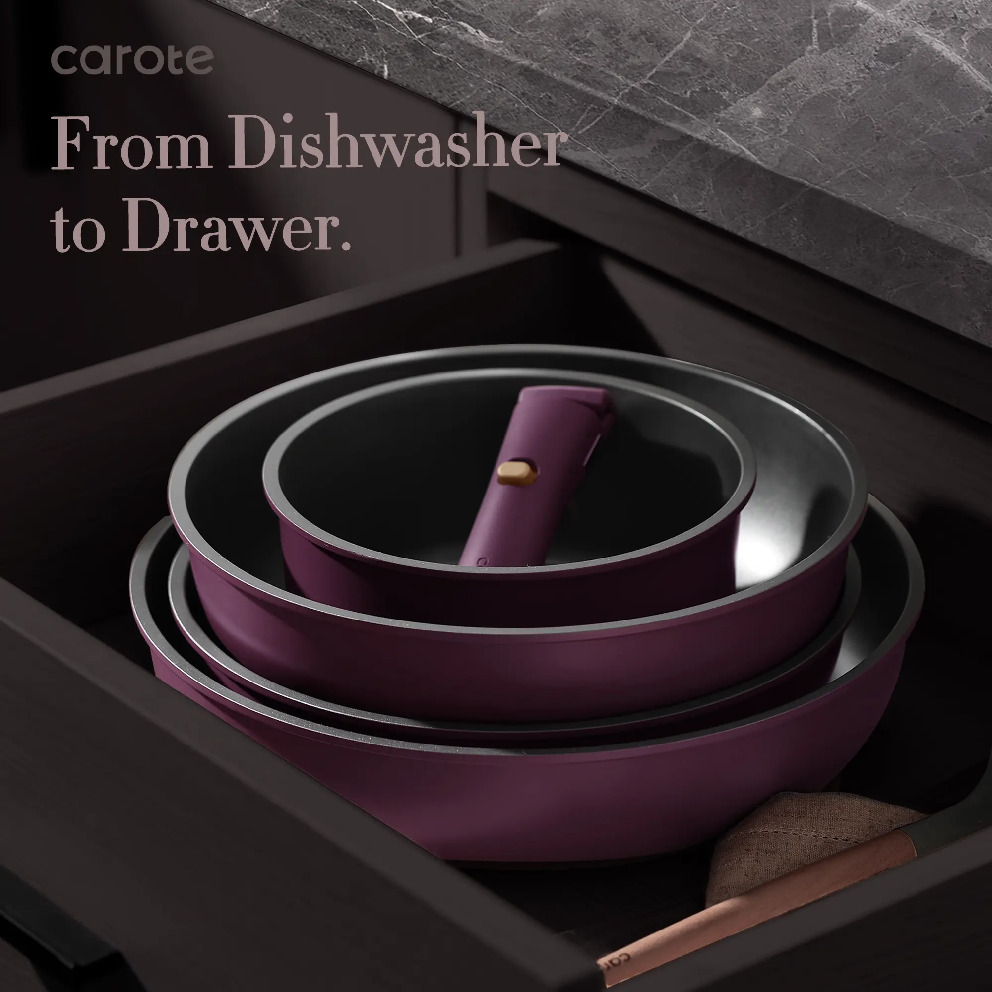 21Piece-Set B(6 pans set): 8" fry pan, 10" fry pan, 12" fry pan, 2-qt saucepan, 3-qt saucepan, 4-qt sauté pan, 2*detachable handles, 7''/8'' storage lid, 7''/8"/10" silicone lid, soup ladle, slotted spoon, steamer, 6*pan protectors.