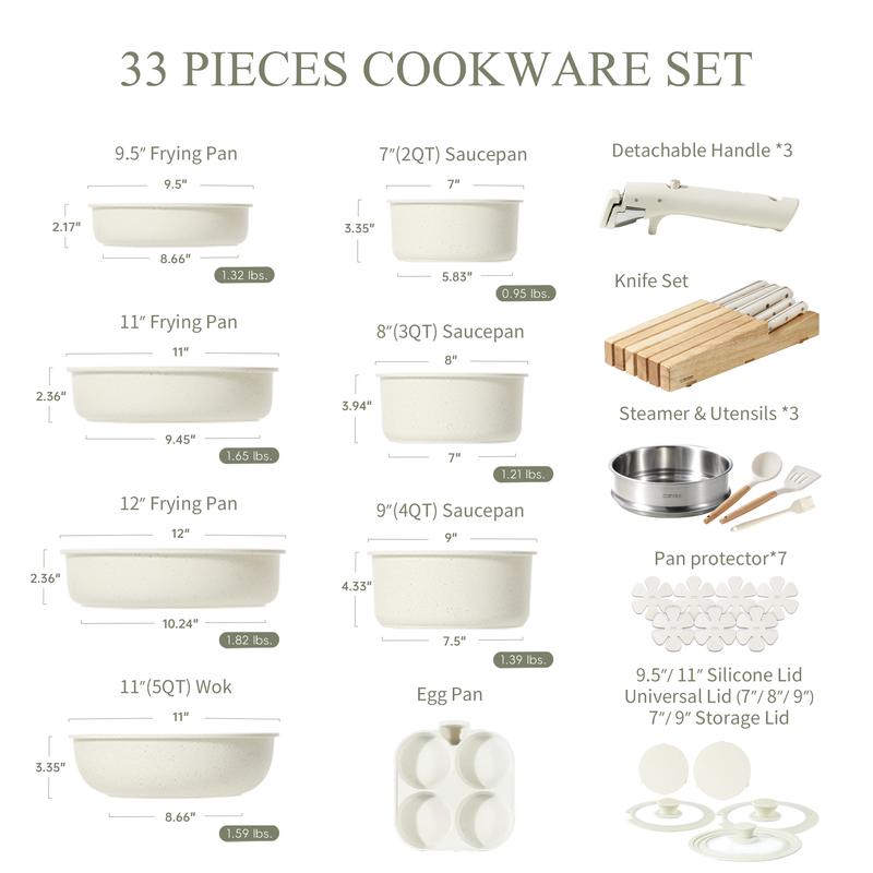 33-Piece Set: 9.5" Frying Pan, 11" Frying Pan, 12" Frying Pan, 7"(2QT) Saucepan, 8"(3QT) Saucepan, 9"(4QT) Saucepan, 11"(5QT) Wok, Egg Pan,Detachable Handle*3,Knife*5,Knife Stand,Steamer ,Utensils *3,Pan protector*7,9.5"/ 11" Silicone Lid,Universal Lid (7"/ 8"/ 9”),7"/9" Storage Lid