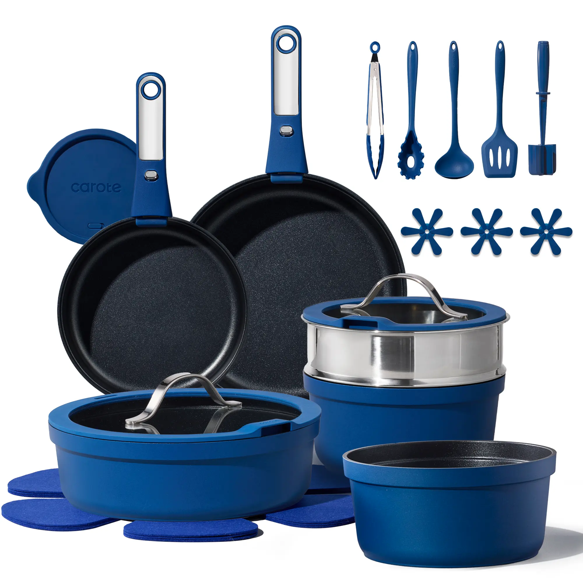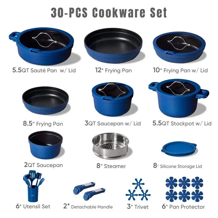 Set Includes: 8.5inch frying pan, 10inch frying pan with lid, 12inch frying pan, 2-qt sauce pan, 3-qt sauce pan with lid, 5.5-qt saute pan with lid, 5.5-qt stockpot with lid, 5pcs utensil with holder, 3pcs trivets, 6pcs pot protectors, 8inch silicone storage lid, 2pcs detachable handle,8inch steamer.