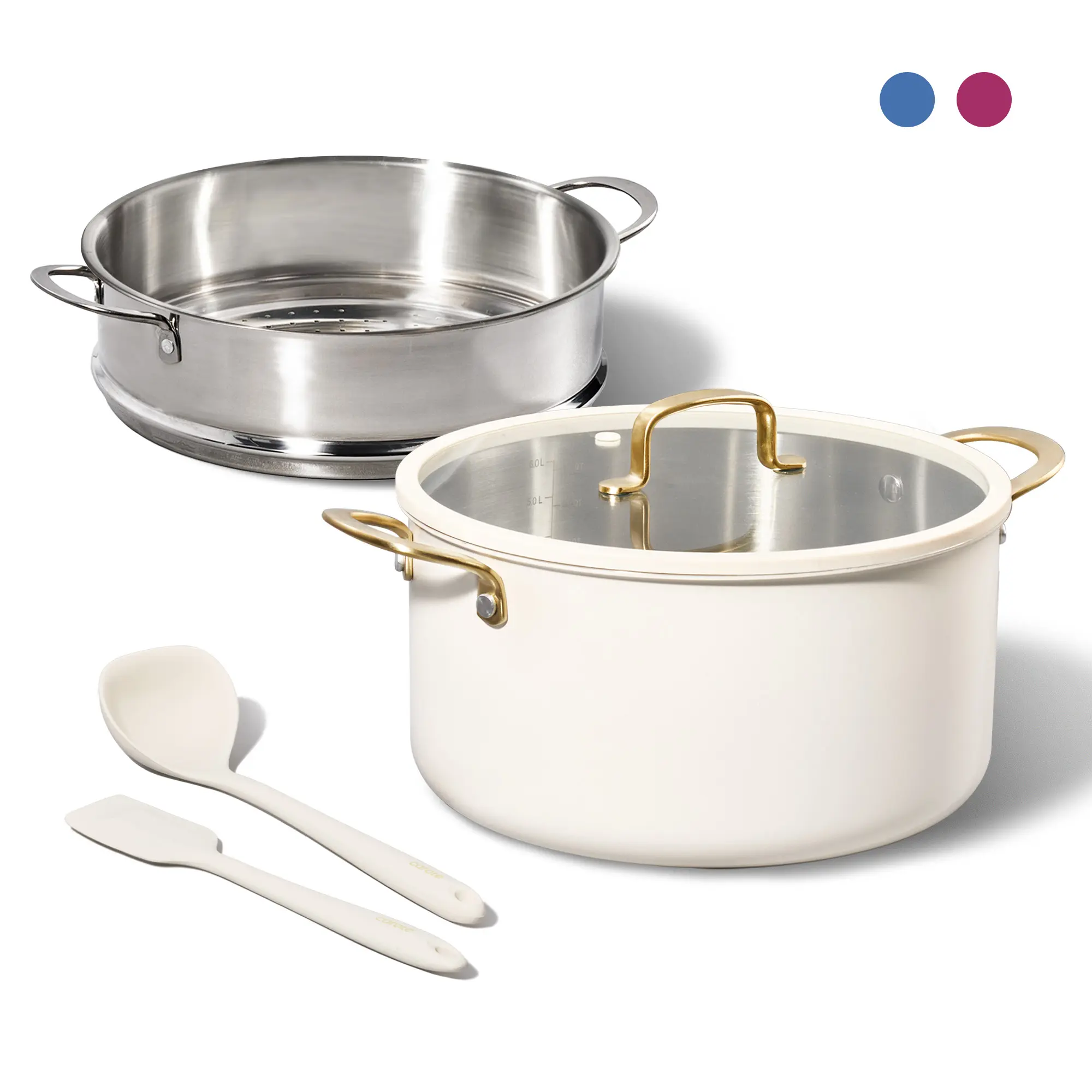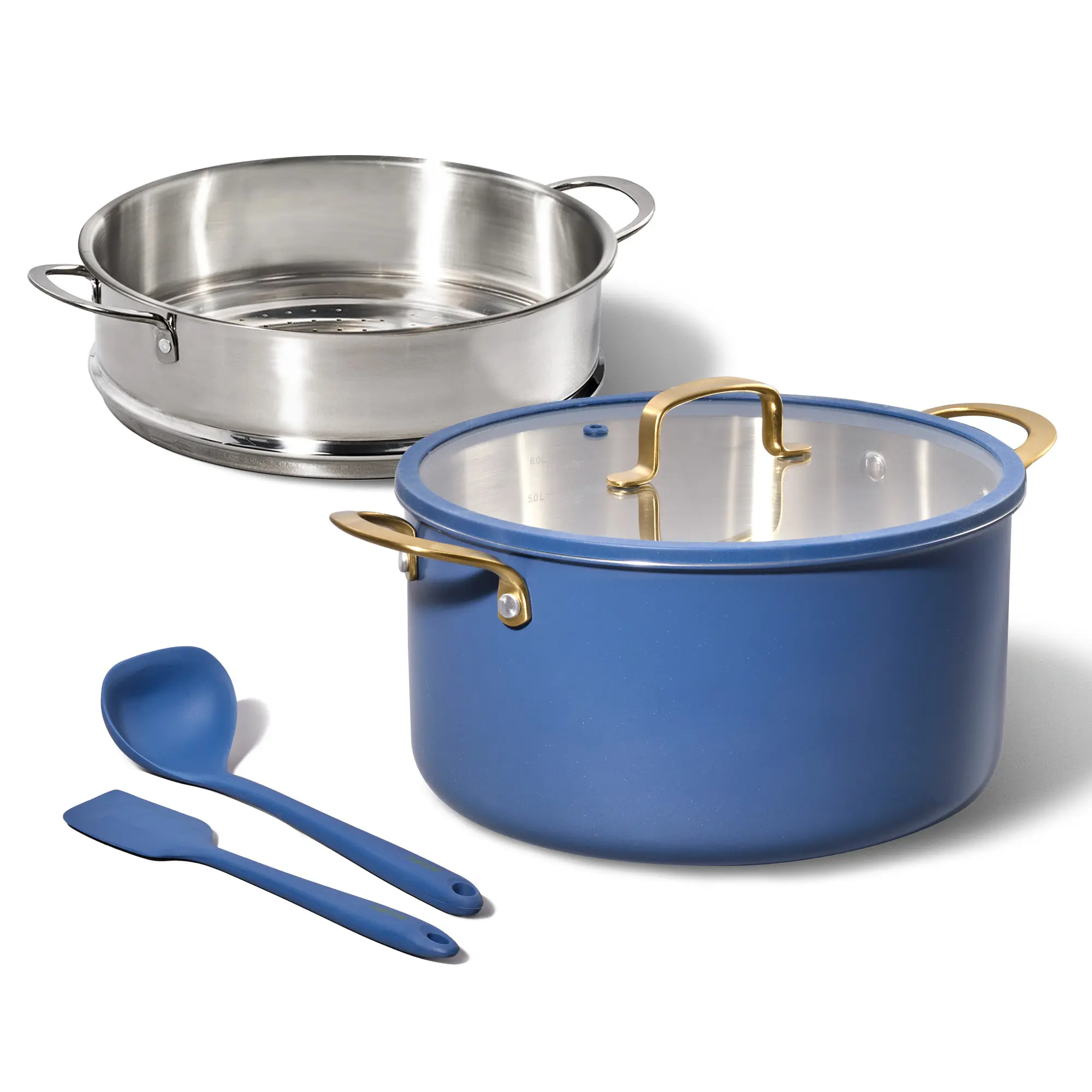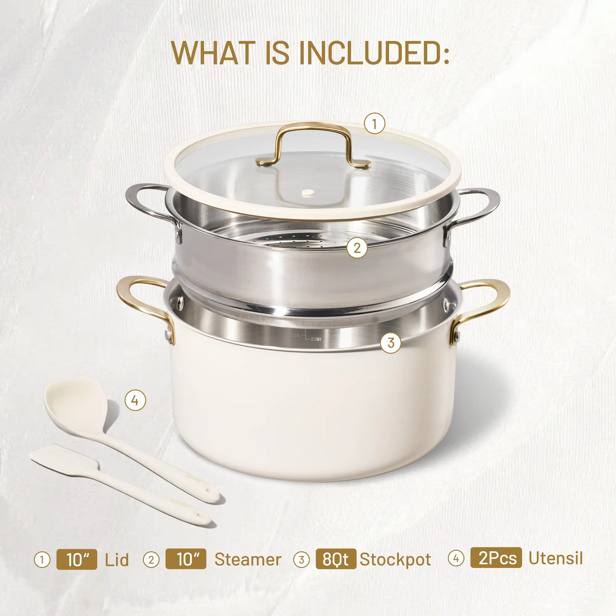 This set includes: 8QT Stockpot with Lid, 10inch steamer, spatula and ladle.