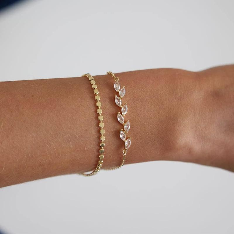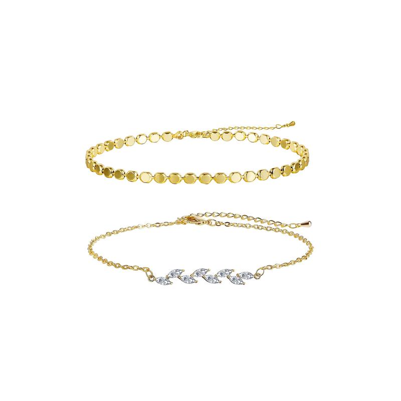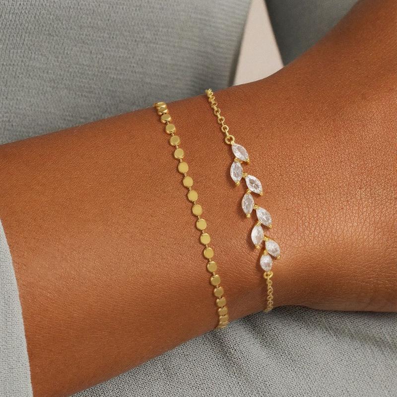 This bracelet set features a 14K gold-plated Cuban chain with leaf-shaped crystal beads. Perfect for stacking, it offers a layered look. The design enhances your style effortlessly, making it suitable for various occasions.