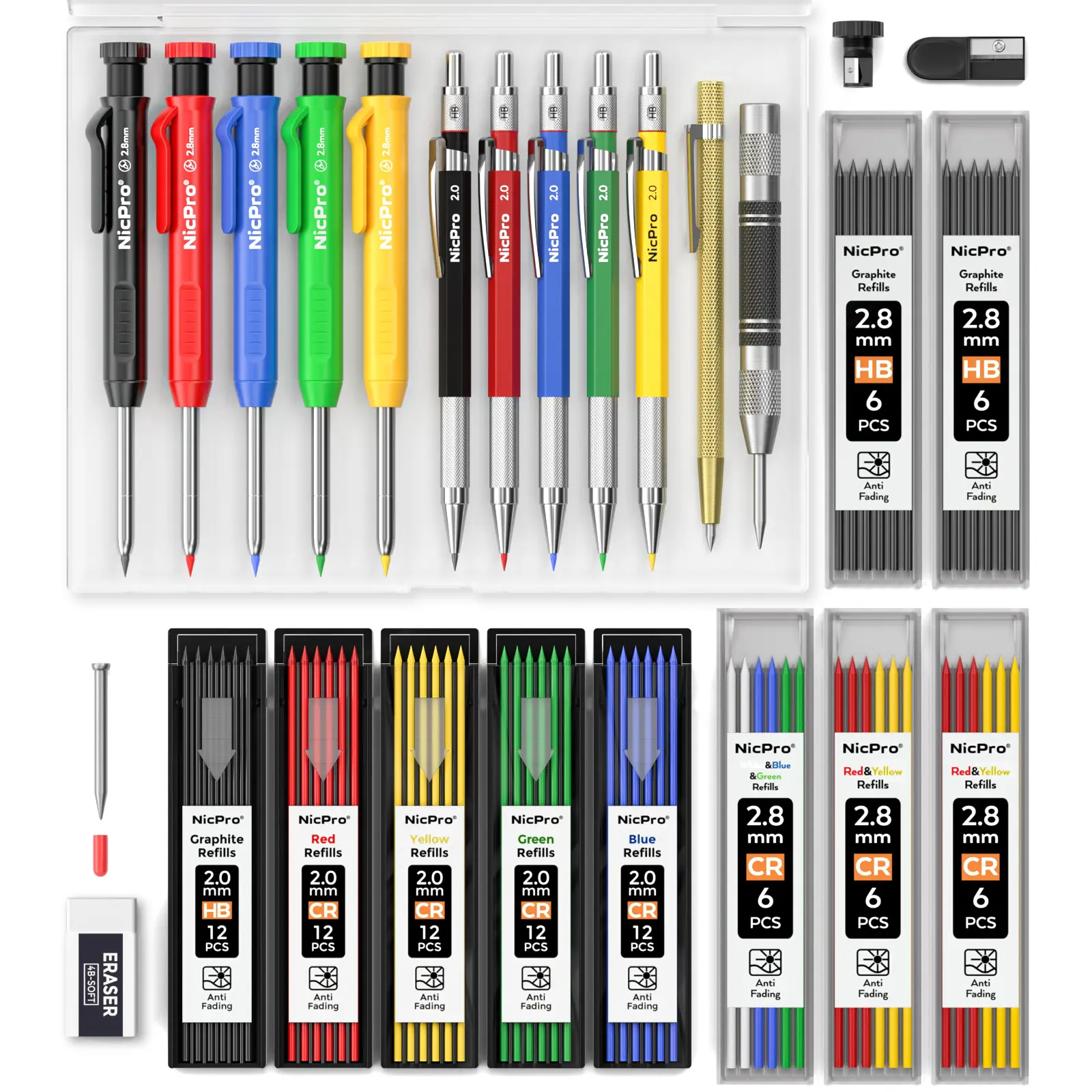 This comprehensive set includes 27 pieces: 100 refills, 10 mechanical carpenter pencils, 1 automatic center punch, and 1 carbide scribe tool. Perfect for architects and construction professionals. Comes with a case for easy storage. 📦