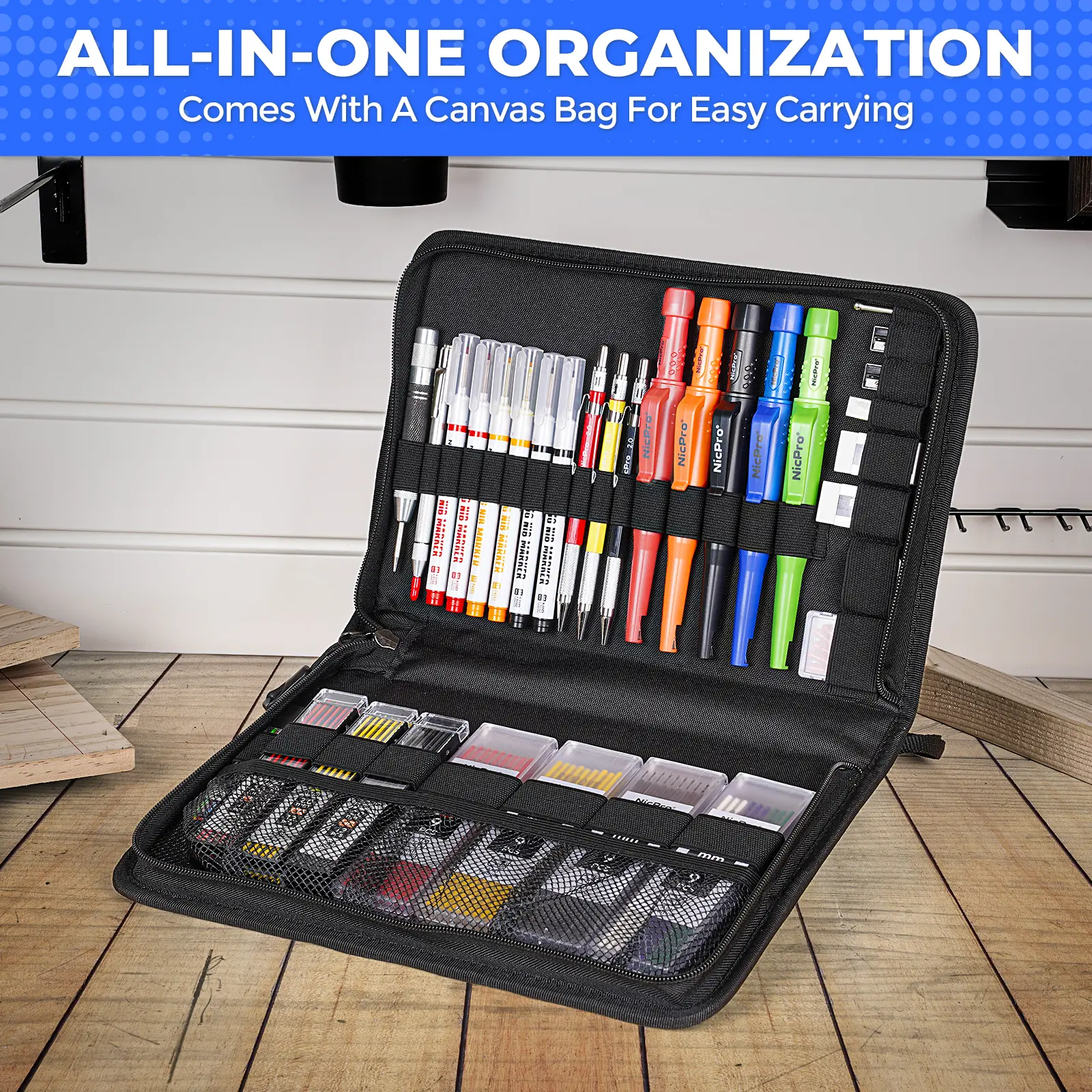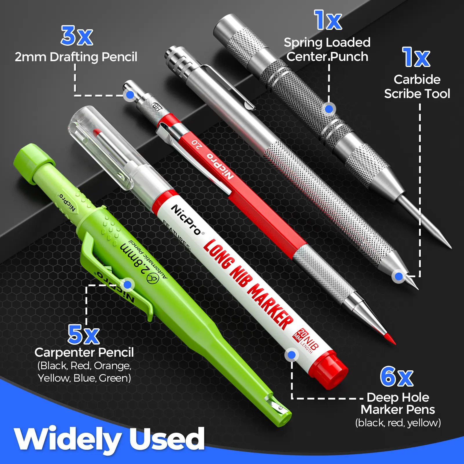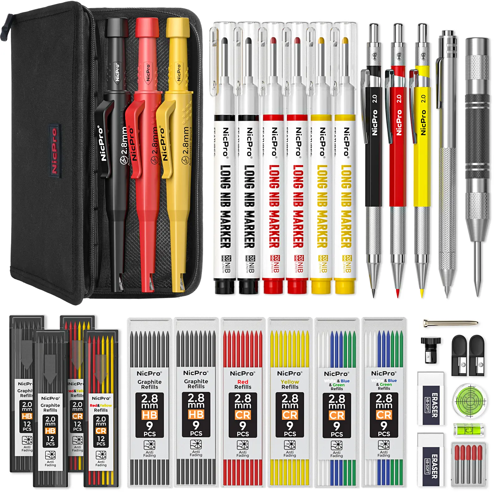 ·All-in-One Solution: This comprehensive set includes everything you need for precise marking and woodworking tasks. With 5 heavy duty construction pencil, 6 pcs long nib marker pens, 3pcs mechanical pencil 2.0mm and various essential carpenter tools like a carbide scriber, automatic center punch and spirit level, all in a nylon carrying case. You're equipped to tackle any project with confidence