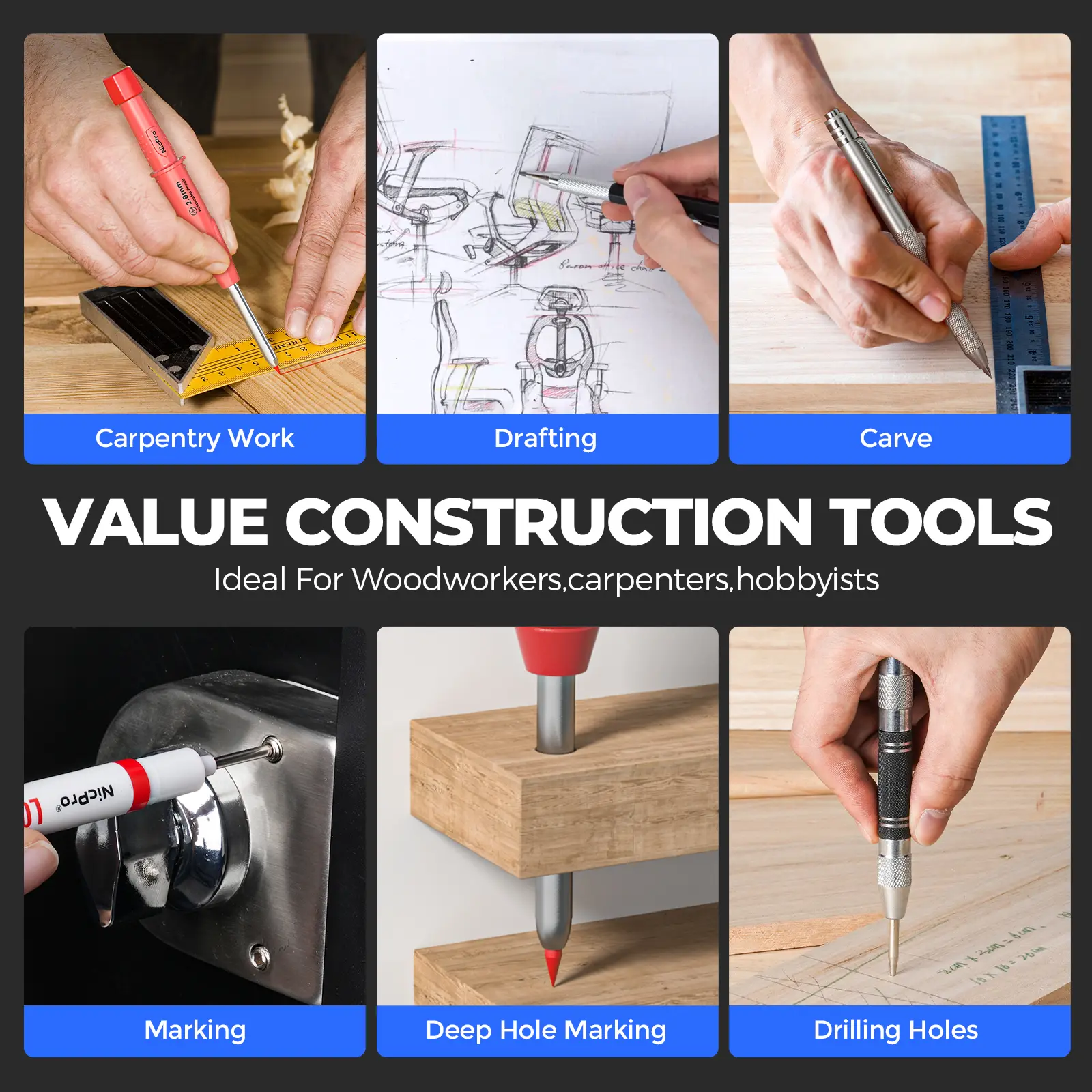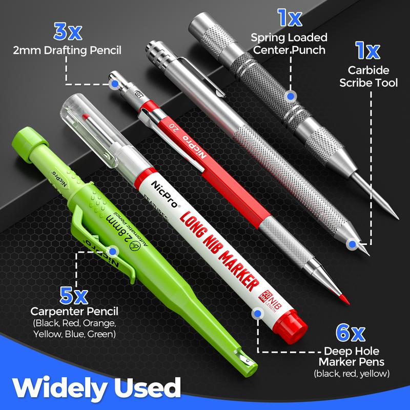 ·Various Carpenter Tools For Wide Use: With a metal carbide scribe tool, which is easy to carve on hard material such as metal, tile, glass, ceramics, wood and more. A Spring Loaded Center Punch can be operated with one hand and accurately mark a centering spot for drilling holes. Come with several size pencil for various line widths, 2mm Drafting pencil ideal for writing and drawing