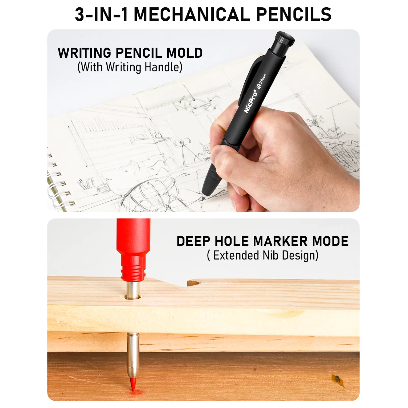 5. Nicpro 6 Pack Upgraded 3-IN-1 Carpenter Pencil Set with Finger Grip, Construction Pencils with 54 Refill & Mini Spirit Level, Deep Hole Carpenter Tool, Mechanical Carpenter Pencil for Woodworking