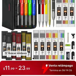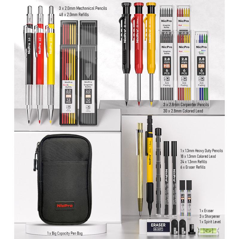 ·ăValue Combination for Youă: You will get 5 Pack 2.8mm solid carpenter pencils with 53 Pack 2.8 mm refills in 6 colors, 3 Pack mechanical pencil 2.0mm with 75 Pack 2.0 mm refills in 3 colors, 1 Pack carbide scribe tool, 1 mini spirit level, 1 count automatic center punch tool with 1 spare needles (replaceable), 1 eraser, 3 sharpeners and 1 count big capacity pen bag. The complete carpenter pencils combination allows you to finish your work faster and more easily.
