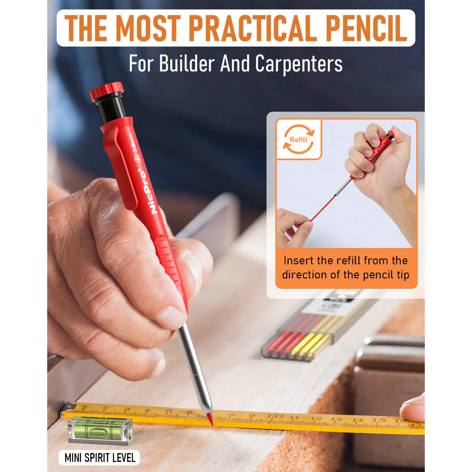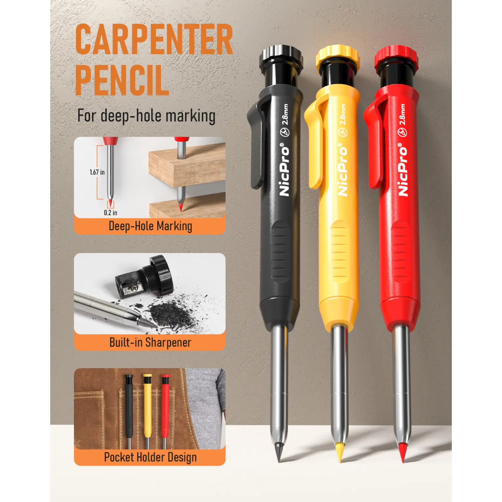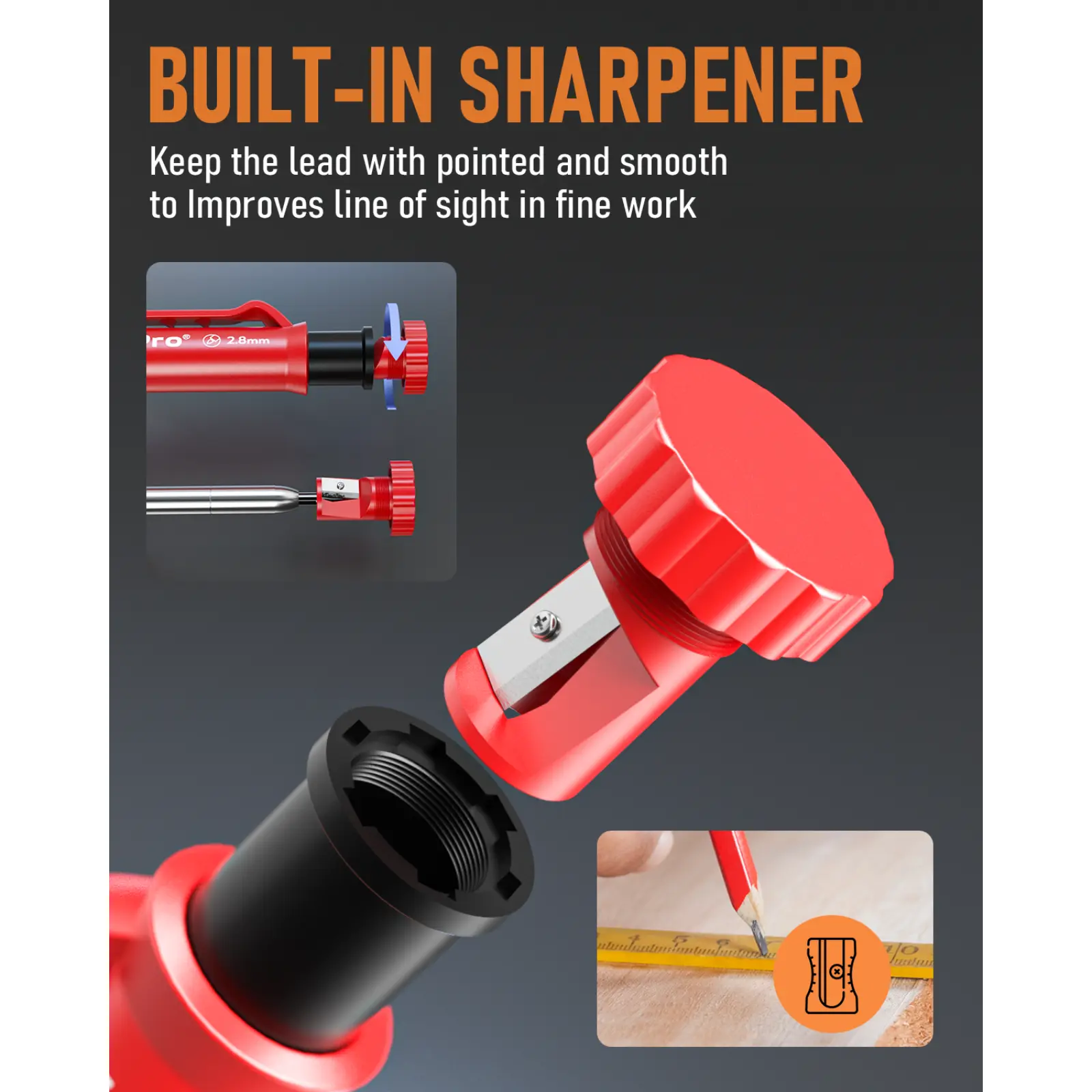 ·【Deep Hole Marker Pencil With Sharpener】: The 3 Pack deep-hole construction pencils adopts 45mm elongated tip design, which is more convenient to mark in the small hole or in other tight areas. In addition this, the woodworking pencils come with a built in sharpener screwed into the top of each work pencil for providing nice precision at all times.