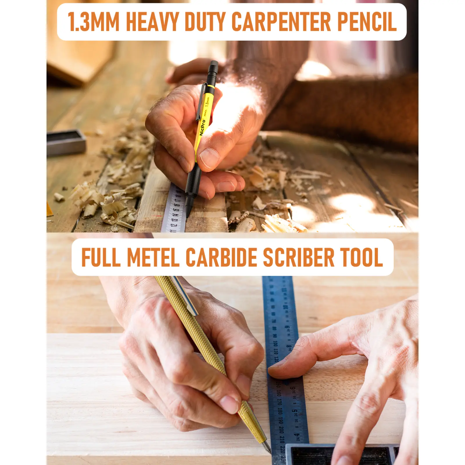 ·【Various Carpenter Tools For Wide Use】: With a metal carbide scribe tool, which is easy to carve on hard material such as metal, tile, glass, ceramics, wood and more. Come with several size pencil for various line widths, 2mm Drafting pencil ideal for writing and drawing. 1.3 carpenter pencil is made of durable resin and metal barrel, strong enough to survives through the toughest conditions, ideal for use in extreme weather conditions.