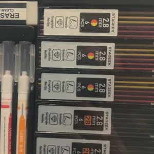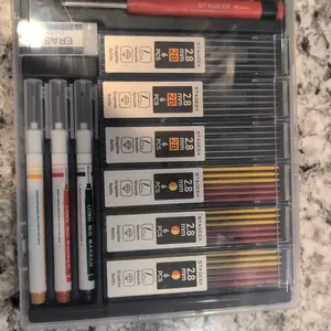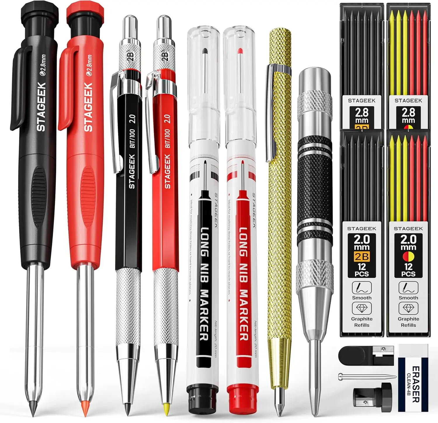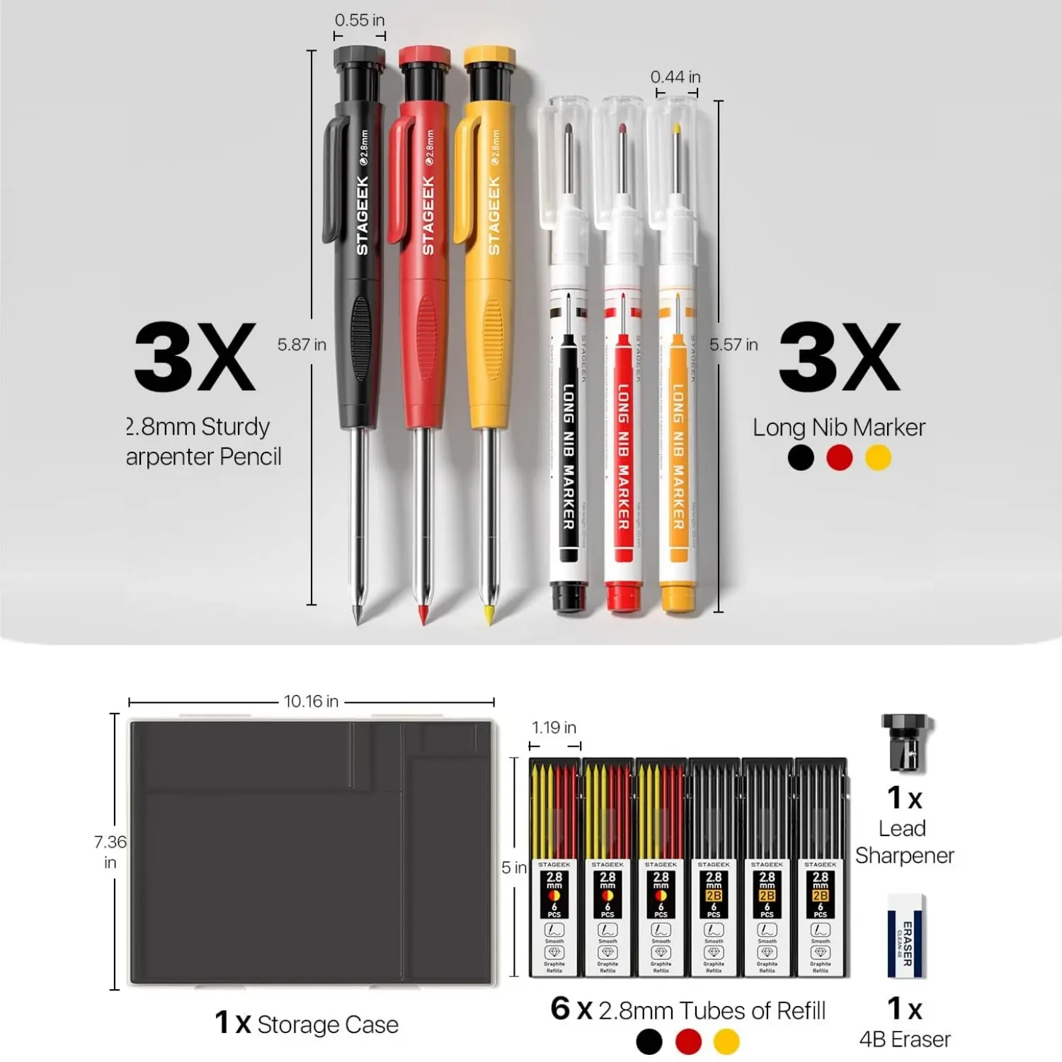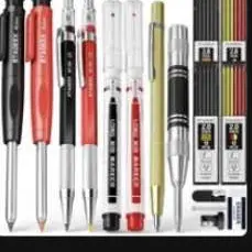 ·【Exquisite Carpenter Pencil Set】: Includes 3pcs sturdy carpenter pencils, 39pcs 2.8mm 2B lead refills in black, red, and yellow. You'll also receive 3pcs Long Nosed Marker Pens in red, black, and yellow ink, a plastic storage box for easy organization. Additionally, the set comes with a replaceable sharpener and a 4B eraser. With this comprehensive collection of tools, completing tasks becomes both swift and effortless.
